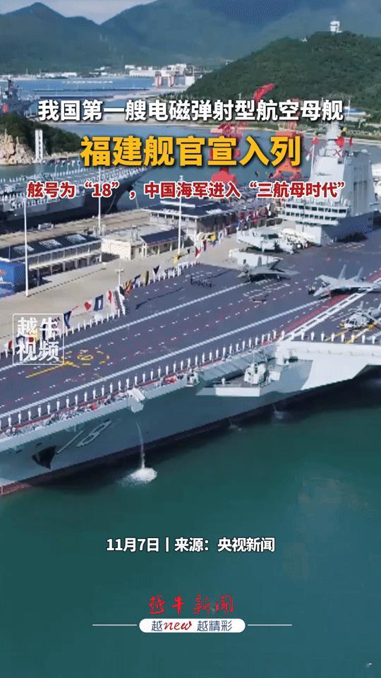 福建舰入列!中国海军迈入“三航母时代”,这一刻太燃了 当福建舰的飒爽雄姿展现在眼前,你是否和无数国人一样,心中涌起阵阵激动?11月7日,我国第一艘电磁弹射型航空母舰福建舰正式官宣入列,舷号“18”,中国海军由此进入“三航母时代”。 从辽宁舰、山东舰到如今的福建舰,每一次航母的突破,都是中国海军实力的铿锵宣言,更是国家国防力量的硬核证明。 福建舰的入列,不仅是海军发展的里程碑,更让每个中国人对国防安全多了一份踏实与自豪,这大国重器的风采,实在提气!