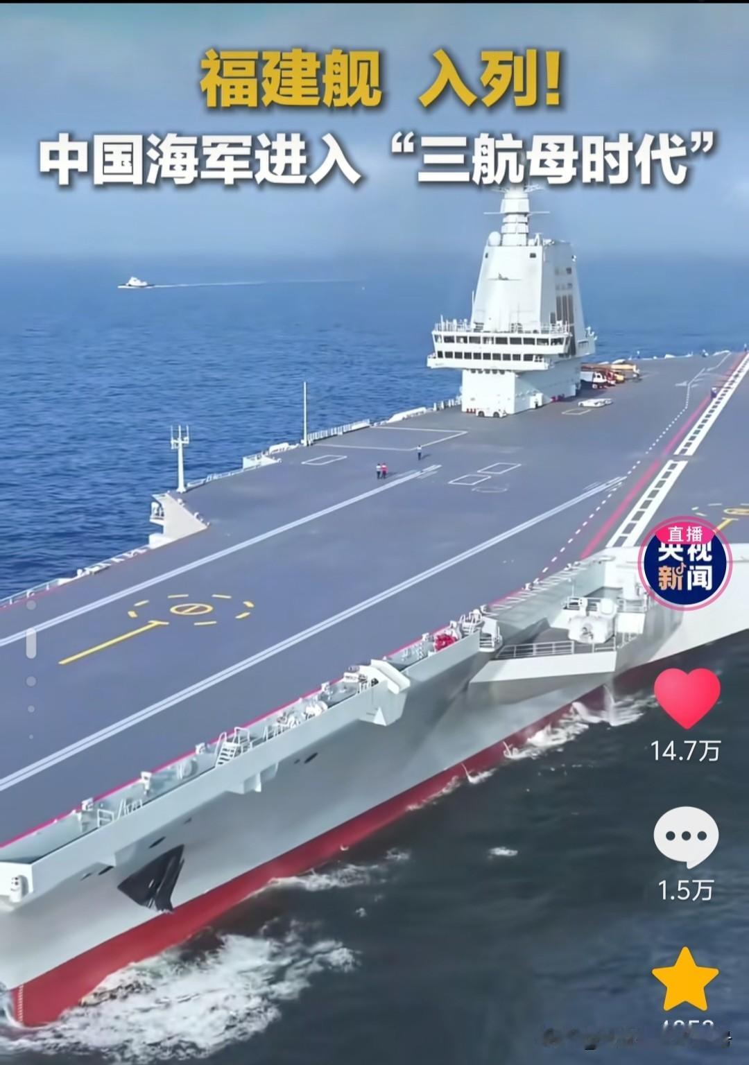 福建舰入列! 中国进入三航母时代! 中国从此可以至少有一支航母编队在远海进行保卫国家主权或实行远洋打击的任务。 威武!中国人民海军! 锃亮的甲板! 雪白的人民子弟兵! 威武列阵的舰载机! 出发! 目标南海! 目标关岛! 目标夏威夷! 目标阿拉斯加! 目标加勒比海! 为了祖国人民安居乐业! 为了世界人民和平相处! 为了惩恶扬善! 我们只有亮剑! 威武! 中国海军! 福建舰