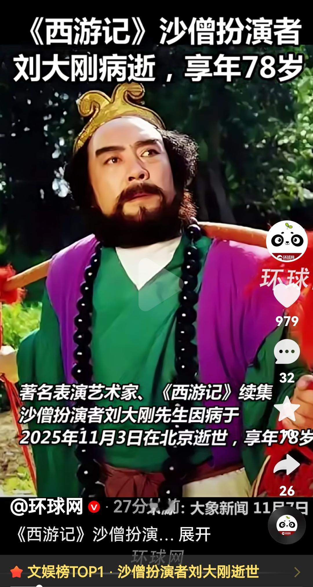 沙师弟走了 根据媒体报道,11月3日《西游记》沙僧扮演者刘大刚在北京病逝,享年78岁 刘大刚老师是京剧演员出身,他演的沙僧角色深受观众喜欢 突然感觉四大名著的老一代艺术家这几年都慢慢离开了 一个时代的记忆和怀念也也都慢慢减少了,这就是长江滚滚东逝水,浪花淘尽英雄 一路走好唐僧扮演者沙僧 扬少华去世 悟空去世 红沙僧 图片来自环球网视频
