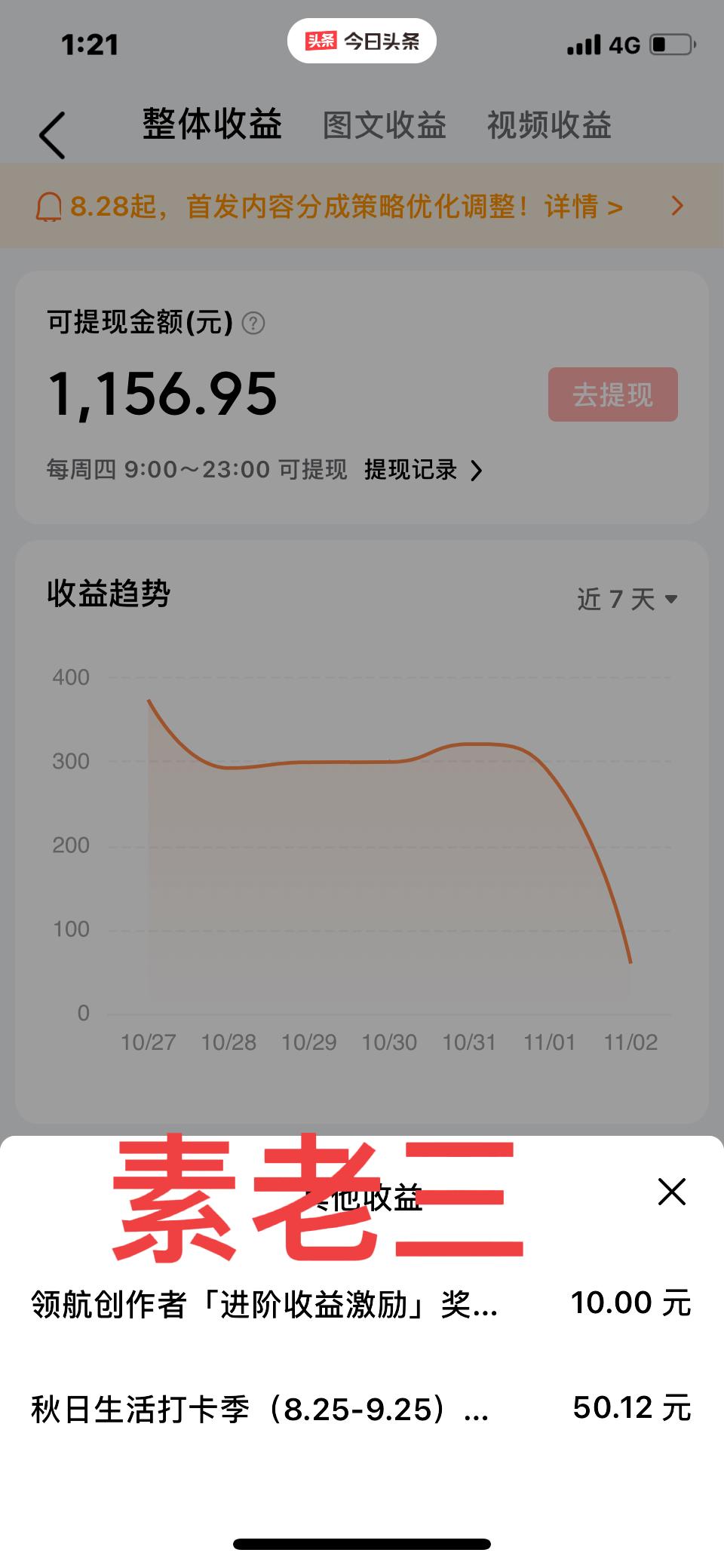 小白别傻了:火≠赚钱! 展现 4w+、评论 600+,互动超 62% 同类, 结果收益才 6.95。 我那篇《头条不能写的几件事》在小白这里算是爆文了吧, 展现 4w+、评论 600+,互动超 62% 同类,结果收益才 6.95。 本以为 “火了就有钱”, 结果是 “热闹一场白忙活”。 哪像素老三,爆文既涨粉又赚 1156, 人家是 “火了 + 赚钱”, 我是 “光火没钱赚”, 干瞪眼。 小白别信 “爆文 = 收益”, 光有热闹没用!