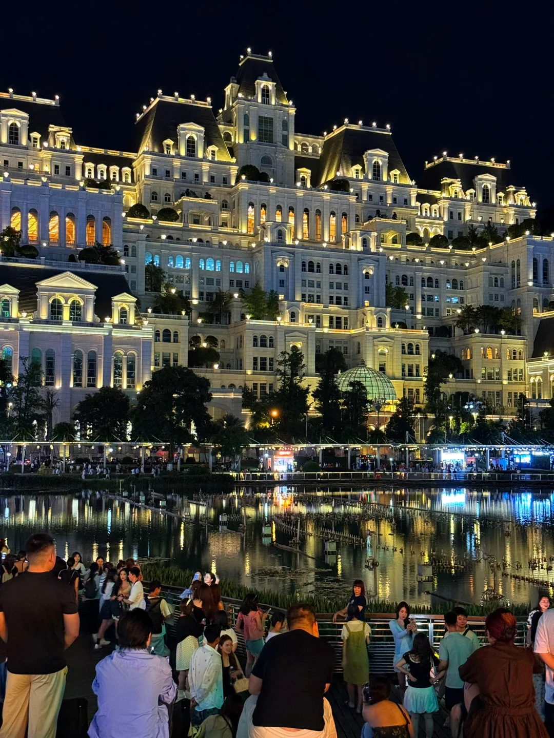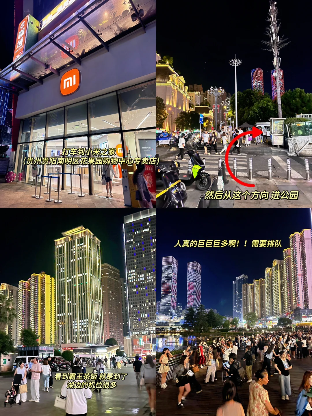 就在贵阳市区!地铁直达 这个爆🔥的机位!!我也拍到啦!! · ✅交通 🚘:打车📍小米之家(贵州贵阳南明区花果园购物中心专卖店),然后从右手边进公园直走30m,看到霸王茶姬就是到了 🚇:地铁3号线 松花路A口出,直走到老凤祥 然后再继续走就能看到霸王茶姬了 (比较推荐地铁,晚上过来太堵车了) · 📸机位 ✔️湖边的侧面也能拍 但是个人感觉拍正面更好看一些,奈何正面人太多 需要排队 · ✅拍照小tips ✔️女生可以穿有一定漏肤度的白色小裙子,会更出片 ✔️这里用相机闪光灯 拍出来后面的房子不是很亮,比较推荐用手机拍,这里环境光不够,需要自带一个补光灯 或者另一个手机的电筒放在拍摄手机前面打光 · ⏰开灯时间:18:30-23:55 大家可以八点左右去拍 天完全黑下来 拍出来更有感觉