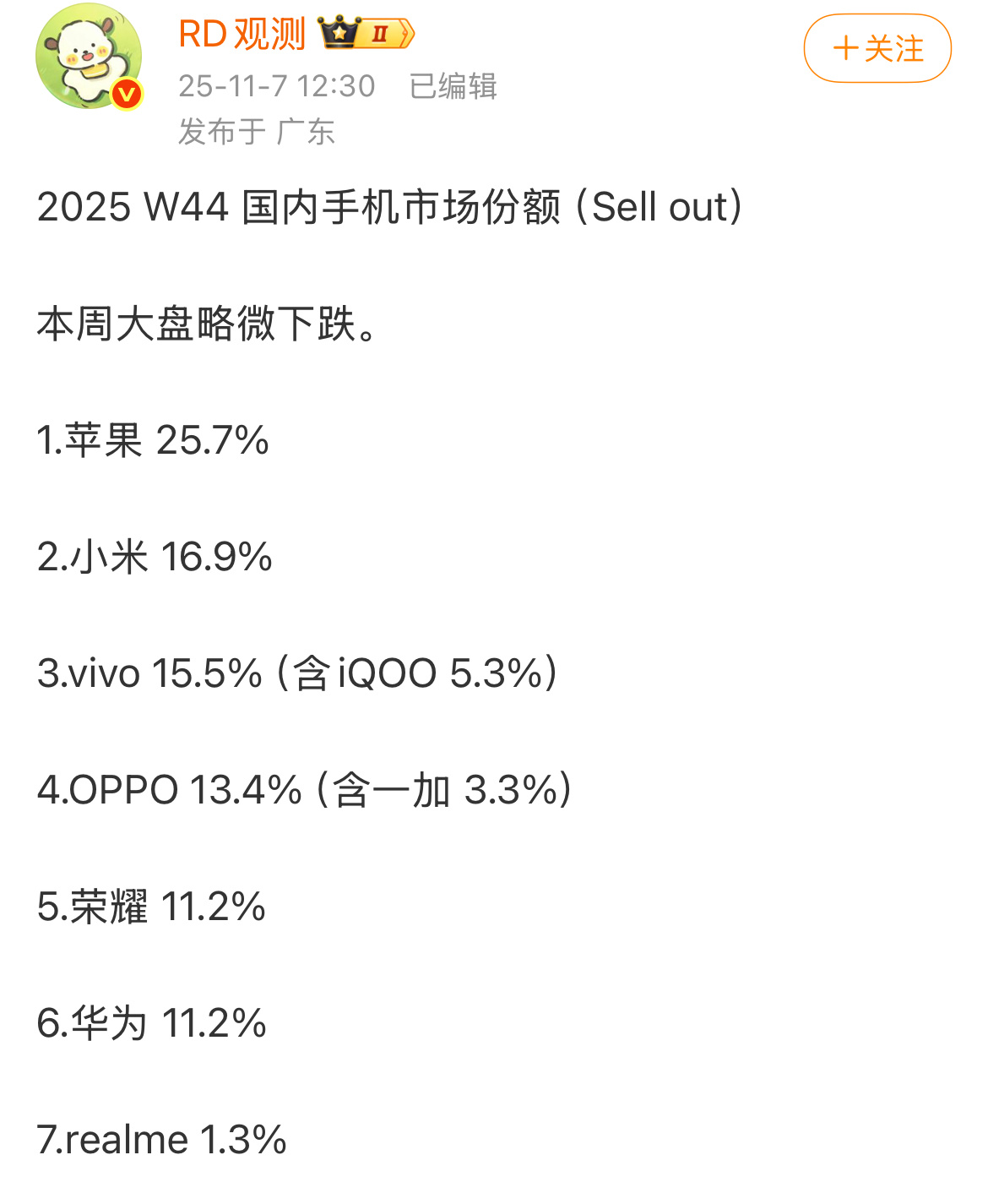 新的一周国内市场份额数据出来了,整体上有下滑的趋势。苹果25.7%位居第一,华为11.2%排在第六位,这个月Mate 80系列就要发布了,你们觉得华为的市场份额可以增加多少? ​​​