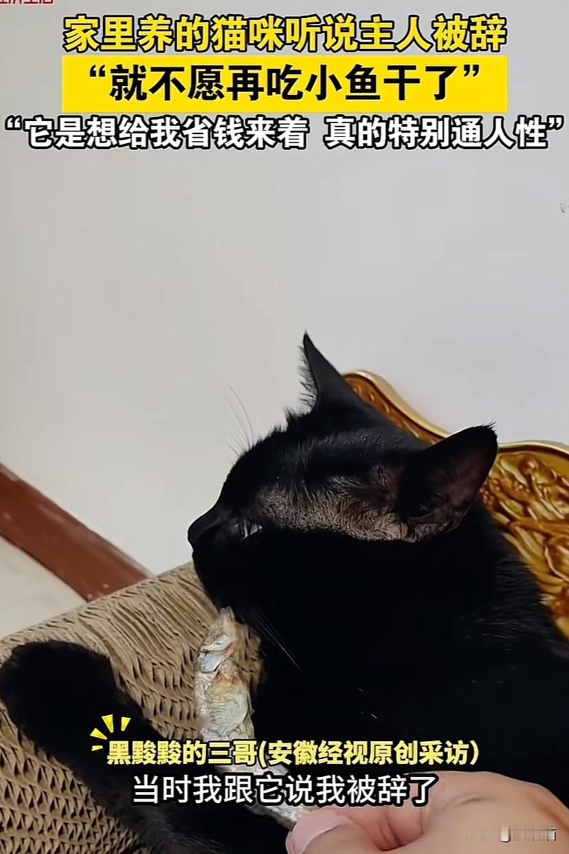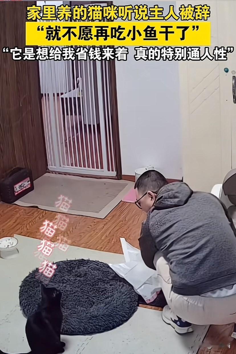 河北燕郊,家里饲养的猫咪听说主人被辞工,为了给主人节省开支,竟不愿再吃小鱼干。主人感动:它是想着为我节约钱,真的特别通人性。 男子饲养了一只黑色的猫咪,这猫咪平时也显得很聪明,经常和男子互动。男子帮它清理猫砂,它在旁边静静的看着。男子对它说:我在帮你清理猫砂呢,你谢谢我呗。 猫咪听后竟对着男子发出几声喵喵,好像在说:谢谢你,辛苦了。看到猫咪如此通人性,男子觉得这猫咪自己养对了。 有一天,男子被公司辞退,他心里有些郁闷。回到家的男子一声不吭的坐在沙发上。 猫咪好像察觉出男子心情不好。它在男子旁边坐下,对着男子喵喵几声,好像在问:主人,你怎么了? 男子看到猫咪关切的眼神,他对猫咪说自己被辞工了,没有工作,就没有收入,以后不能经常给你买小鱼干了。 猫咪听后用爪子扒拉几下男子的手,好像在说:没有关系。 说也奇怪,从那以后,男子再给猫咪买小鱼干,它不吃了。无论男子怎么逗它,猫咪都不为所动,甚至在男子把小鱼干送到它嘴边,它也不吃。 看到猫咪这样,男子知道它是体谅自己没了工作和收入,它不吃小鱼干就可以为自己节约一点开支。男子的心深受感动,他觉得这猫咪实在是通人性了。