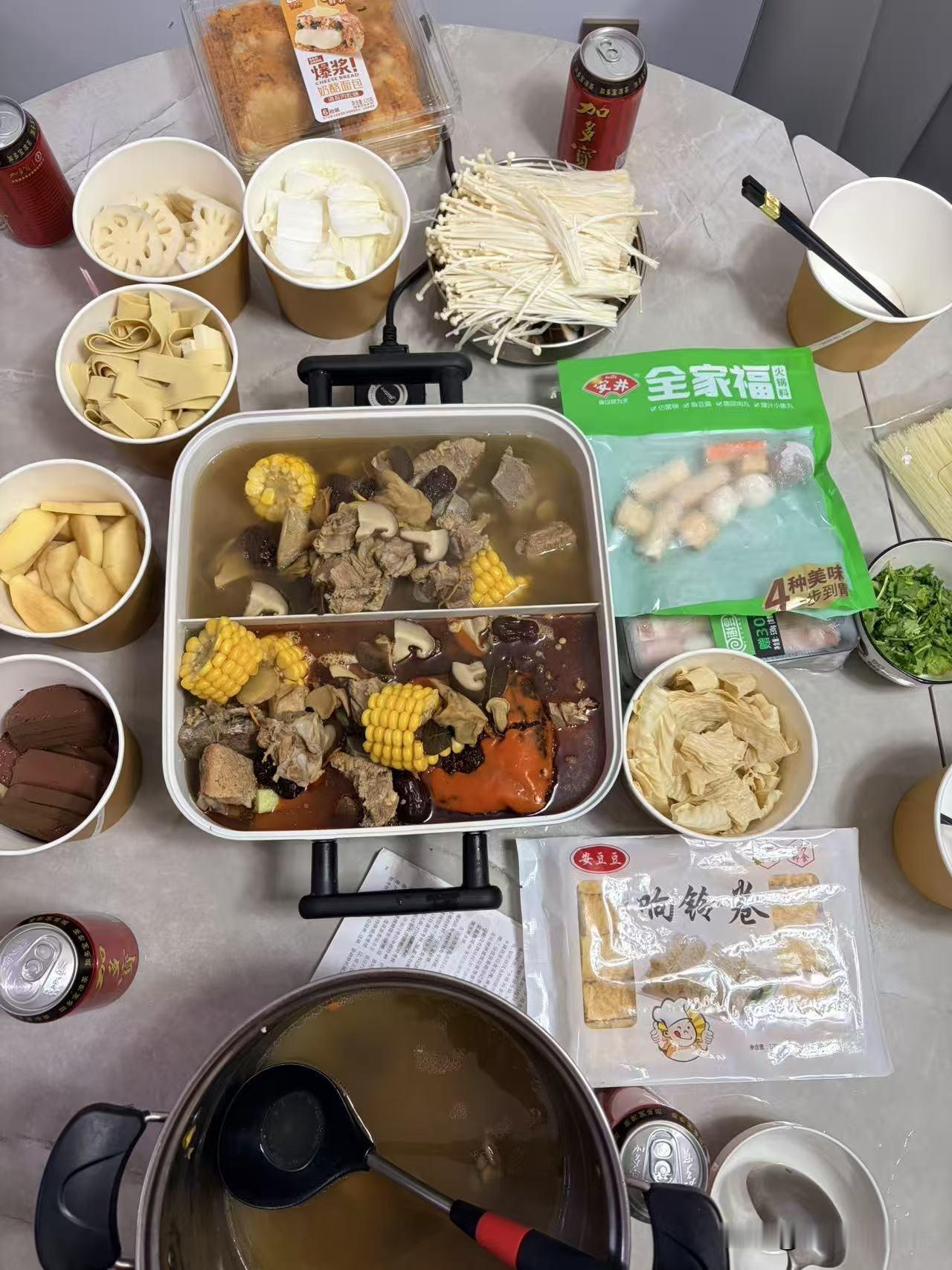 冷冷的下雨天,没有什么比来一顿热气腾腾的火锅更舒服的了。 炖点排骨,再整点羊肉、丸子、土豆、莲菜、豆腐皮、金针菇,一家人围坐在一起,炫口热辣滚烫的肉或菜,再喝一口冰爽的凉茶,那滋味,别提有多美了。 与吃其他饭相比,吃火锅时能咽下更多的东西,真的是吃的肚皮圆滚滚,酣畅淋漓。 今晚我是吃美了,整个人都吃困了,这会躺在床上一动不想动,不一会就神游物外了,难道这就是晕碳的感觉吗?真的好舒服啊。 吃完饭去倒垃圾时,发现楼下的邻居也是吃的火锅去倒垃圾,人家就比较豪放了,直接端着锅去倒,啊哈哈。 大家今晚吃火锅了吗?