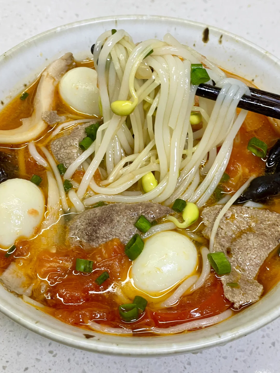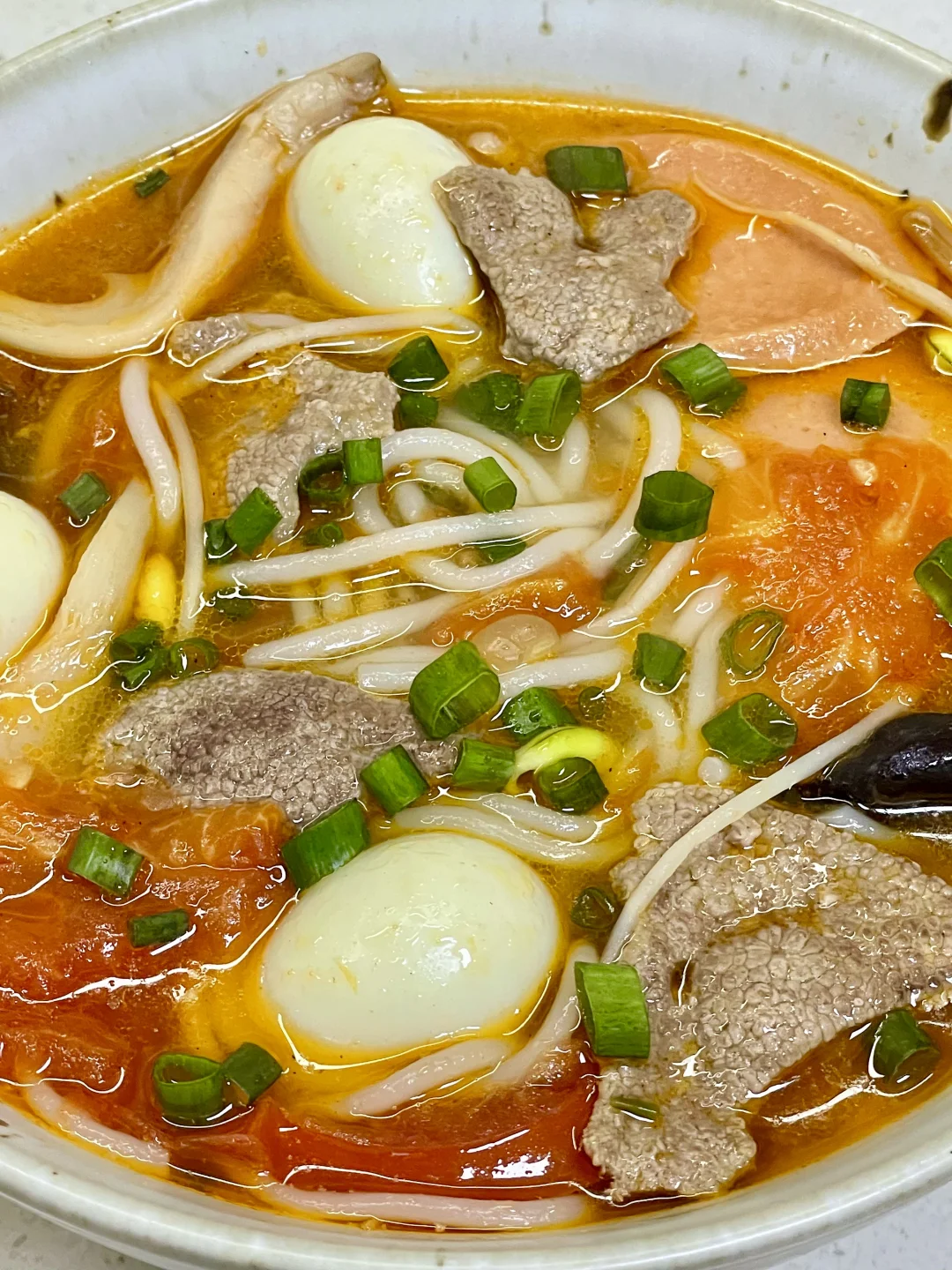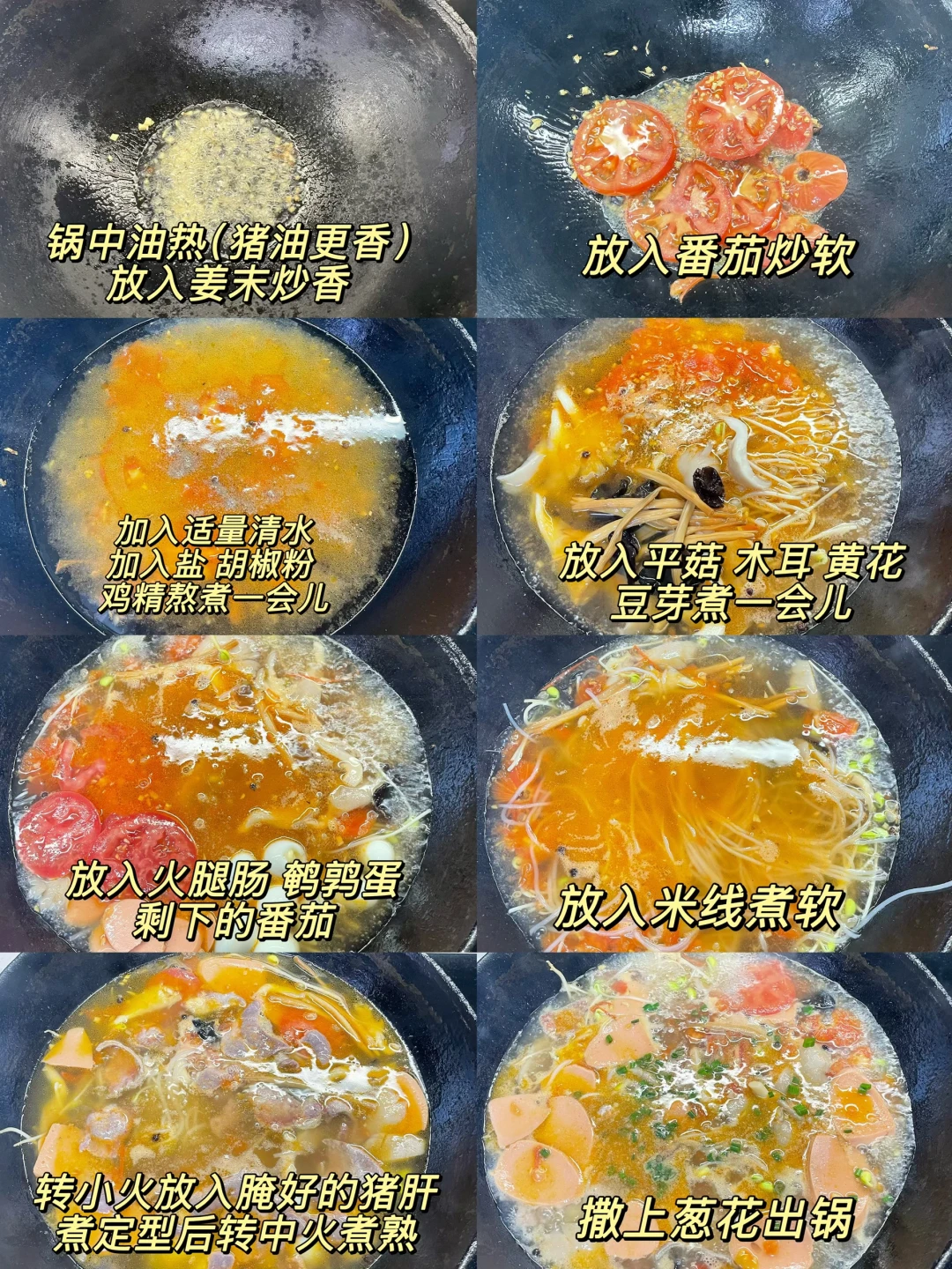三鲜米线也太美味了吧,天冷了来上一碗暖乎乎,汤汁都可以喝完[自拍R] 1⃣️:猪肝切薄片,加入少许盐和淀粉抓匀(不喜欢吃猪肝的可以换成瘦肉)锅中油热倒入姜末炒香,倒入二分之一番茄炒软,倒入适量开水,加盐 胡椒粉 鸡精调味 2⃣️:放入黄花 木耳 平菇 豆芽煮软,再放入米线煮2分钟,放入鹌鹑蛋 火腿肠 剩下的番茄继续煮几分钟 3⃣️:转小火放入猪肝煮定型,再转中火煮半分钟,关火加入葱花即可