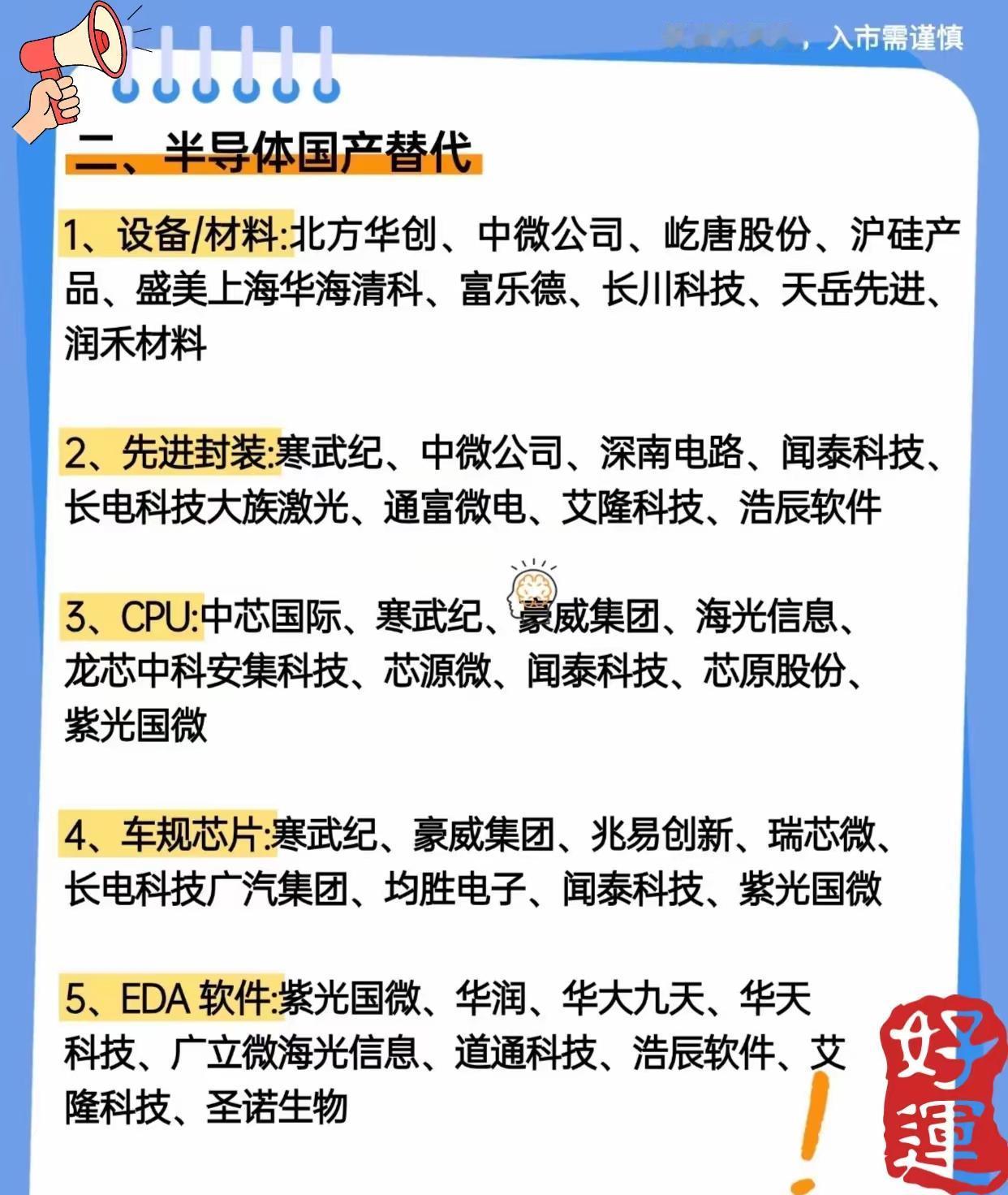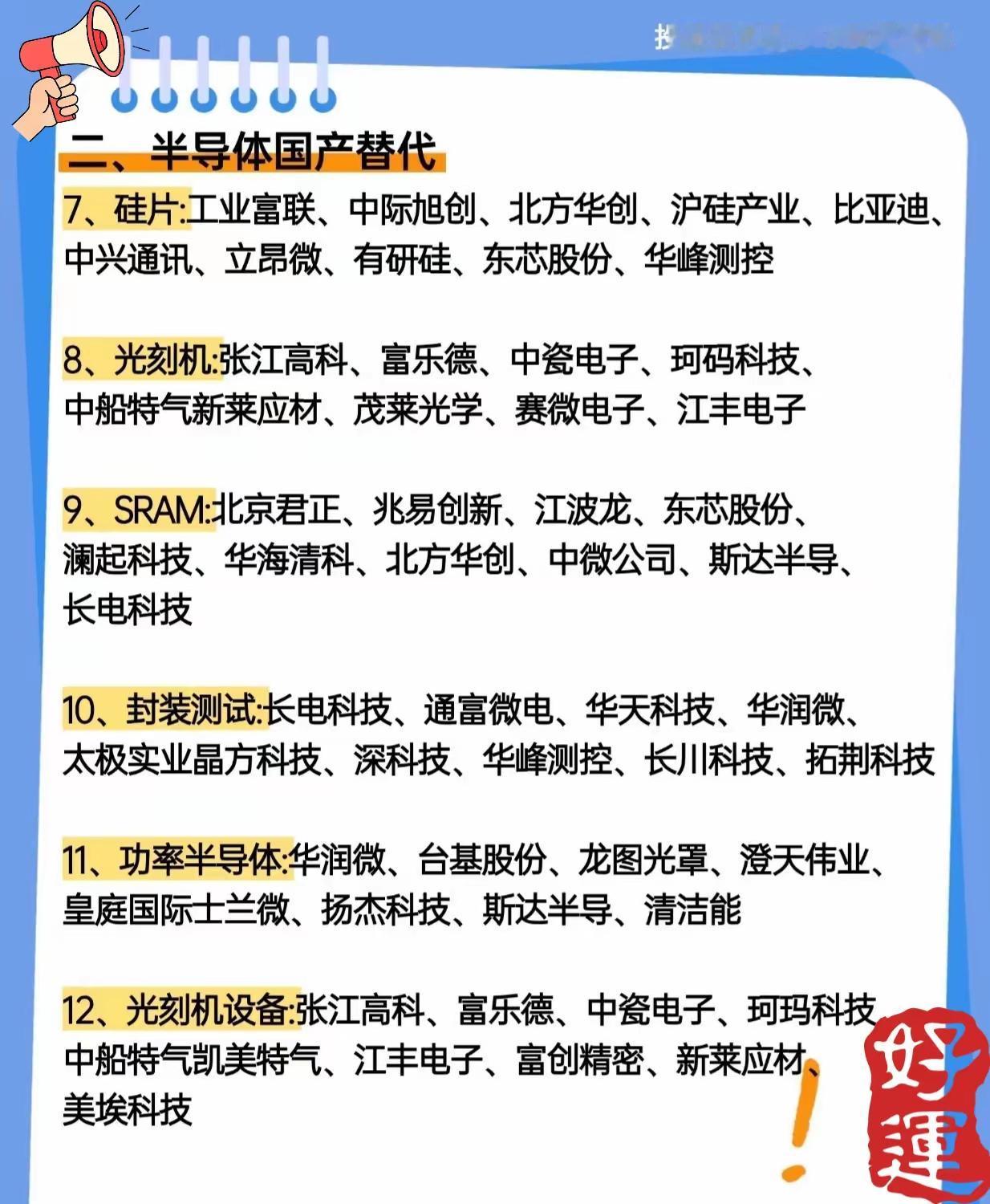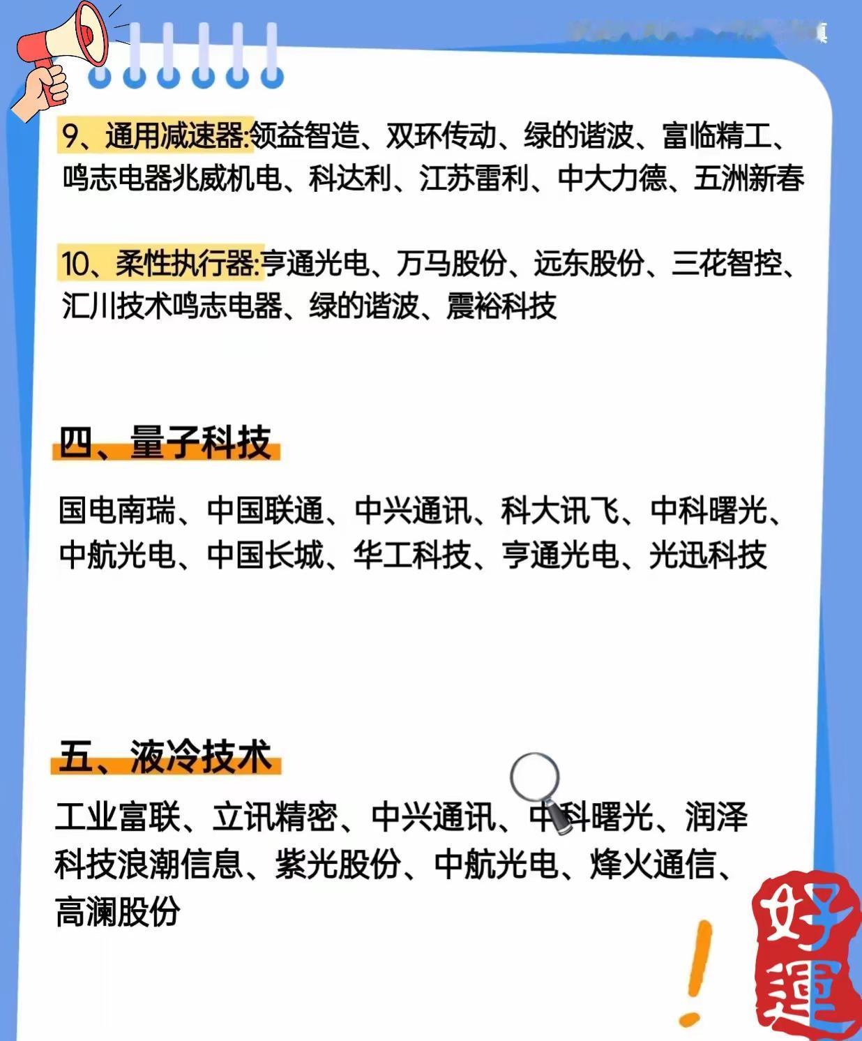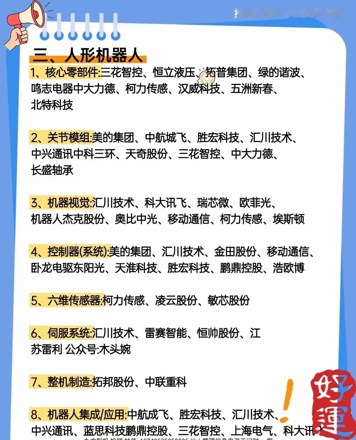 围绕“未来科技七大赛道”展开,介绍了当前科技领域中具有发展潜力和投资关注度的多个热门方向,涵盖相关核心技术与产业链上的主要企业。 第一张图聚焦“人工智能AI与算力”,这是未来科技的重要基础赛道。内容分为六大细分领域:算力芯片(如工业富联、寒武纪、海光信息等)、液冷散热(如工业富联、中兴通讯、英维克等)、算法(如中国移动、寒武纪、海康威视等)、量子计算(如中国移动、中国电信、紫光股份等)、PCB(如东山精密、鹏鼎控股、沪电股份等)以及光模块CPO(如紫光股份、锐捷网络、天孚通信等),展示了支撑AI发展的关键硬件与软件技术及对应的主要上市企业。 第二张和第三张图共同介绍“半导体国产替代”这一关键赛道,强调国内在半导体核心环节实现自主可控的重要性。细分领域包括:设备/材料(如北方华创、中微公司、沪硅产业等)、先进封装(如寒武纪、长电科技、通富微电等)、CPU(如中芯国际、海光信息、龙芯中科等)、车规芯片(如寒武纪、兆易创新、广汽集团等)、EDA软件(如紫光国微、华大九天、广立微等),此外第三张图还补充了硅片(如工业富联、沪硅产业、立昂微等)、光刻机(如张江高科、中瓷电子、江丰电子等)、SRAM(如北京君正、兆易创新、澜起科技等)、封装测试(如长电科技、通富微电、华天科技等)、功率半导体(如华润微、士兰微、斯达半导等)以及光刻机设备(如张江高科、富创精密、美埃科技等)相关企业,全面覆盖半导体产业链上下游国产化重点环节。 第四张图介绍“人形机器人”赛道,这是人工智能与机械工程融合的前沿应用方向。内容细分为八大类别:核心零部件(如三花智控、绿的谐波、中大力德等)、关节模组(如美的集团、汇川技术、中航成飞等)、机器视觉(如汇川技术、科大讯飞、奥比中光等)、控制器(系统)(如美的集团、汇川技术、卧龙电驱等)、六维传感器(如柯力传感、凌云股份等)、伺服系统(如汇川技术、雷赛智能等)、整机制造(如拓邦股份、中联重科等)以及机器人集成/应用(如中航成飞、蓝思科技、科大讯飞等),展示了人形机器人从核心部件到系统集成再到落地应用的全产业链相关企业。 第五张图则介绍了另外三个前沿科技板块:通用减速器与柔性执行器(如领益智造、亨通光电、万马股份等)、量子科技(如国电南瑞、中国联通、中科曙光等)以及液冷技术(如工业富联、立讯精密、高澜股份等)。这些板块分别涉及精密传动部件、下一代计算技术的前沿探索以及高算力场景下的散热解决方案,同样是未来科技发展中不可或缺的组成部分。 综合来看,这五张图片系统梳理了未来科技发展的七大核心赛道——人工智能AI与算力、半导体国产替代、人形机器人、通用减速器与柔性执行器、量子科技、液冷技术等,每个赛道下又细分多个关键领域,并列举了众多相关的代表性上市企业,为了解和跟踪未来科技产业布局、技术趋势及投资方向提供了较为全面的参考信息。 “投资有风险,入市需谨慎”。