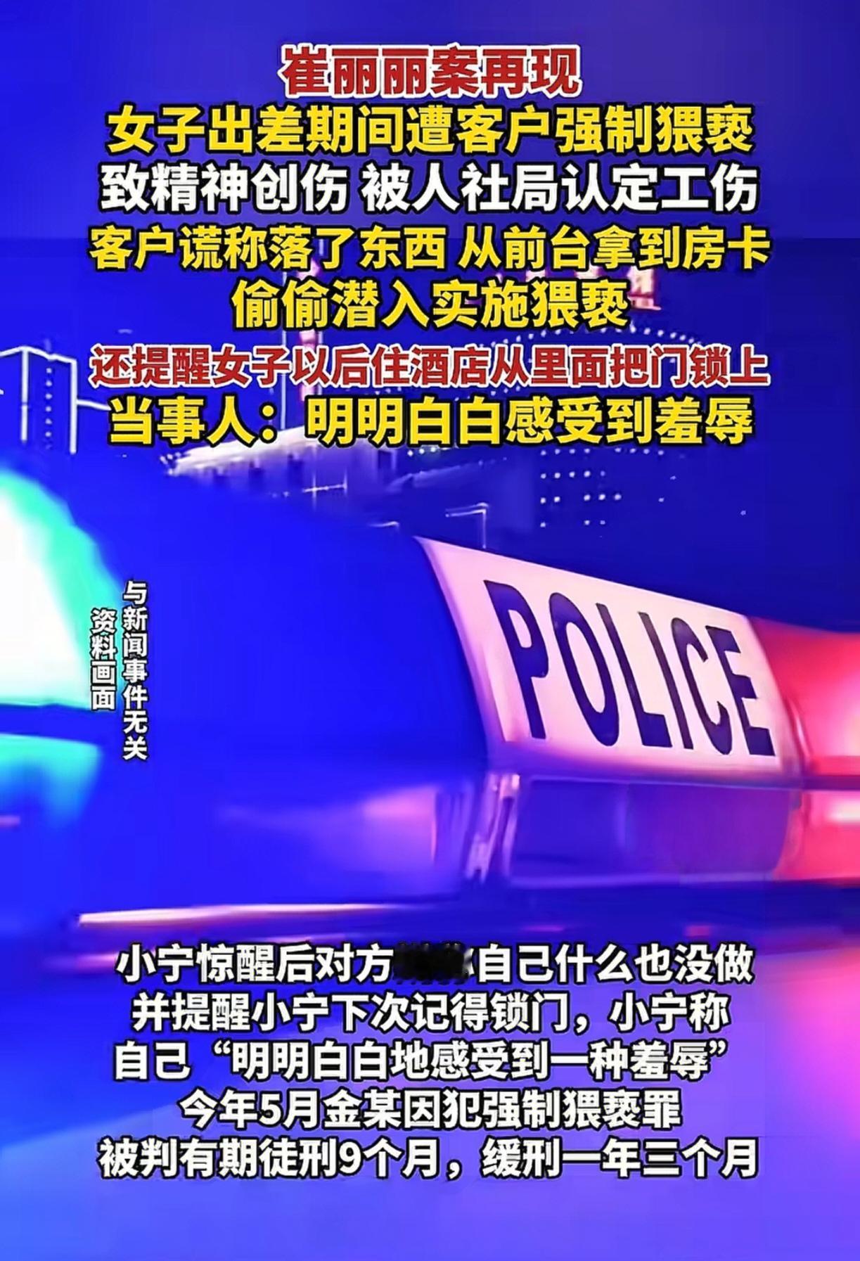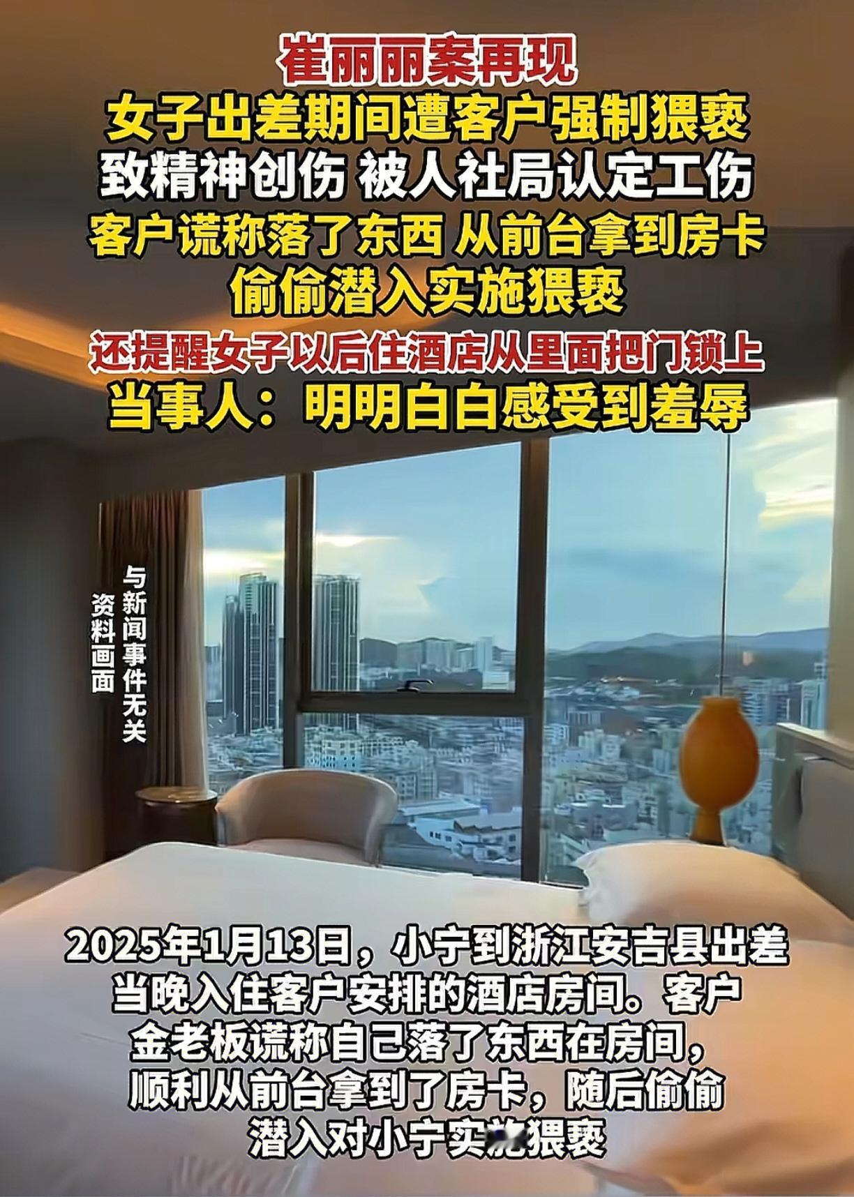 崔丽丽案刚结束不久,杭州又出现了一起同样的案件。 杭州一女子到安吉县出差,入住客户安排的酒店,半夜发现有人在蹭自己下面,睁开眼后发现对方正是当晚一起吃饭的客户。离开前,还提醒她以后住酒店要记得锁门。 更让人心寒的是,女子被吓出创伤后应激障碍,根本没法复工,公司却不批病假,三番五次劝她主动离职。 真的,看一次气一次。女生出个差,连最基本安全都成问题。出事后,公司第一时间急着撇清关系。这一次又一次的案件不停的敲响警钟,女性因工出差,她们的安全该如何保障?崔丽丽案 女性安全