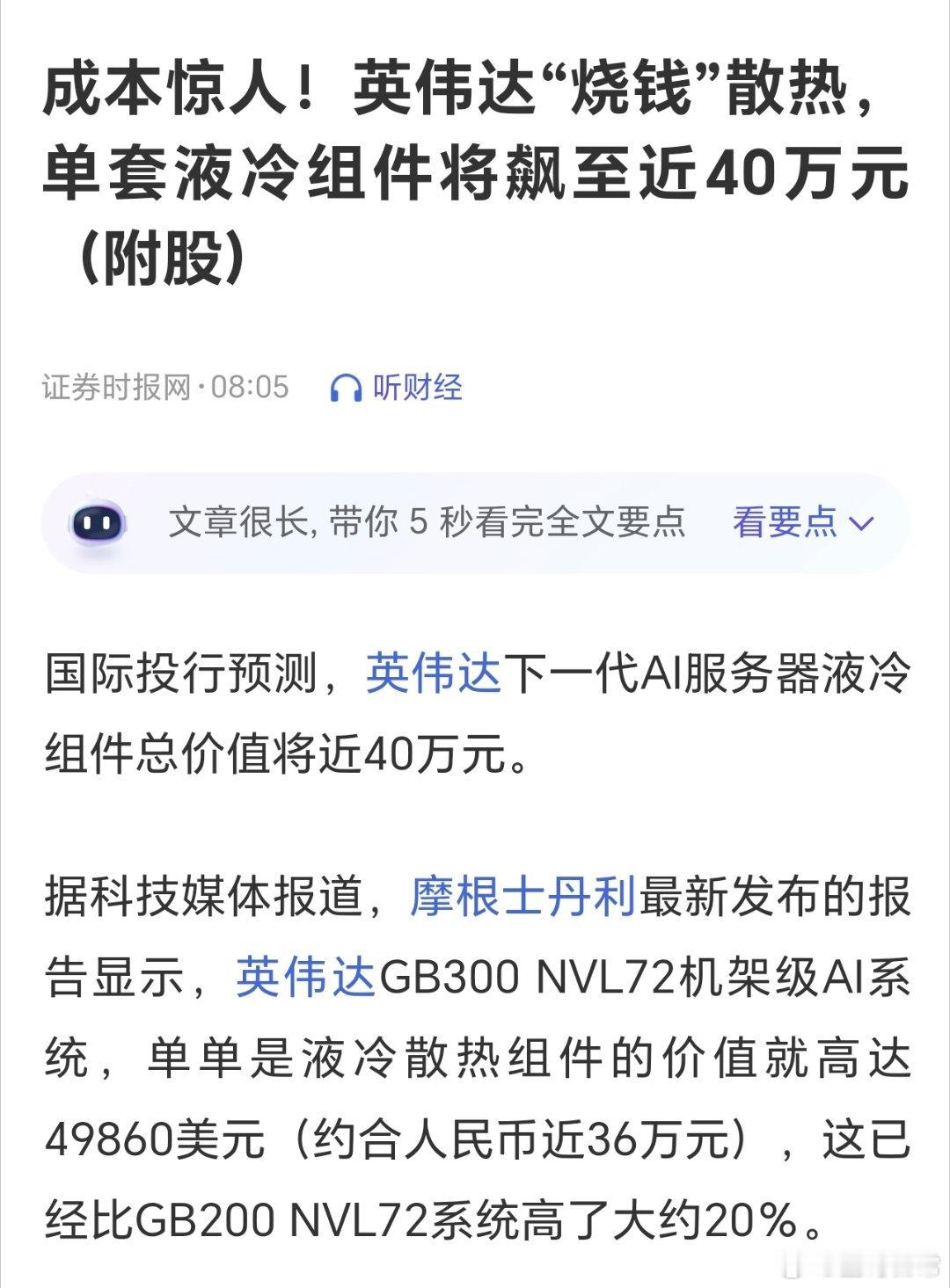 英伟达下一代AI服务器液冷组件总价值将近40万元。A股液冷组件的,有几个确实不错
