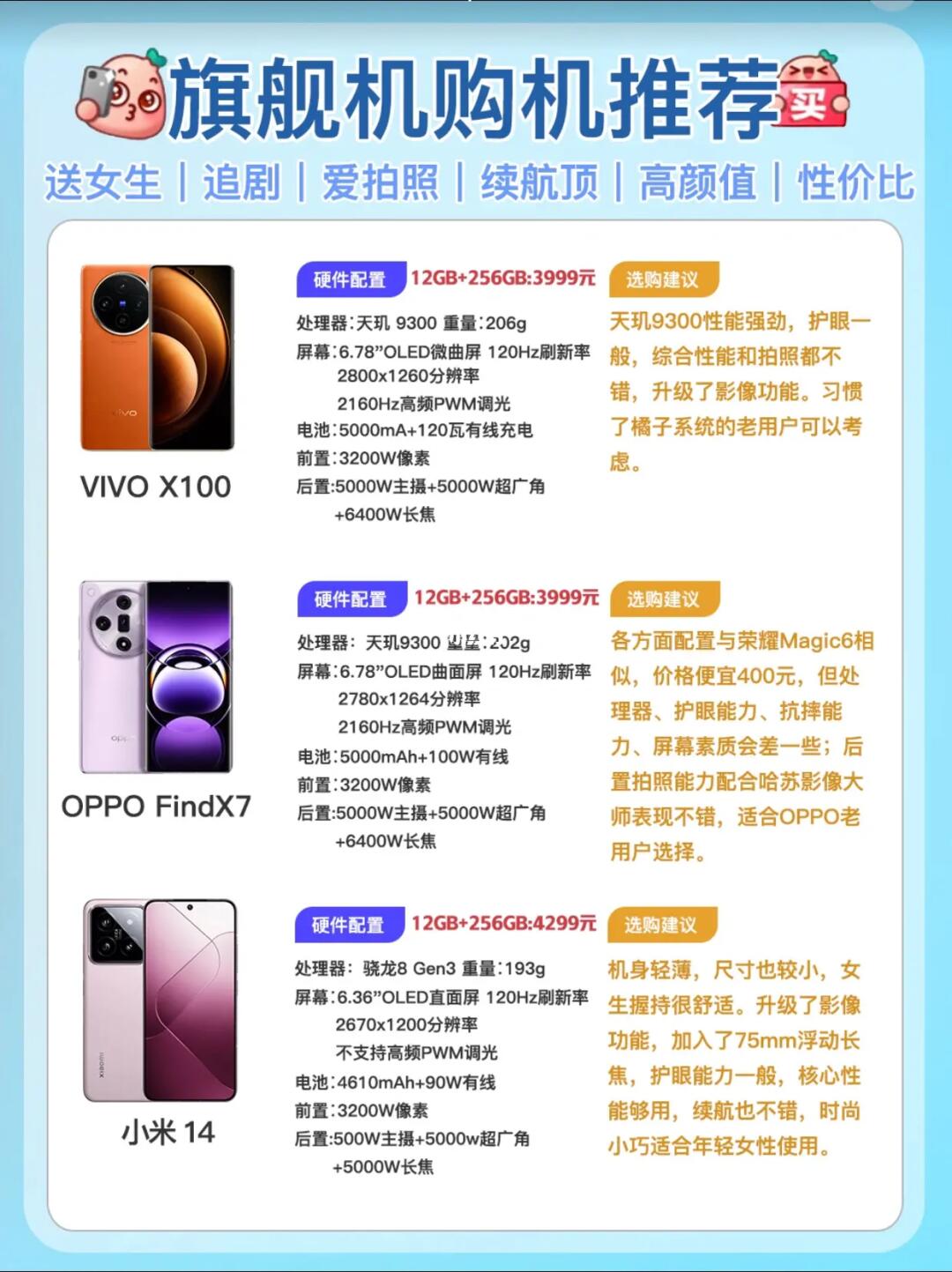 推荐:荣耀 Magic6、OPPO FindX7、小米14