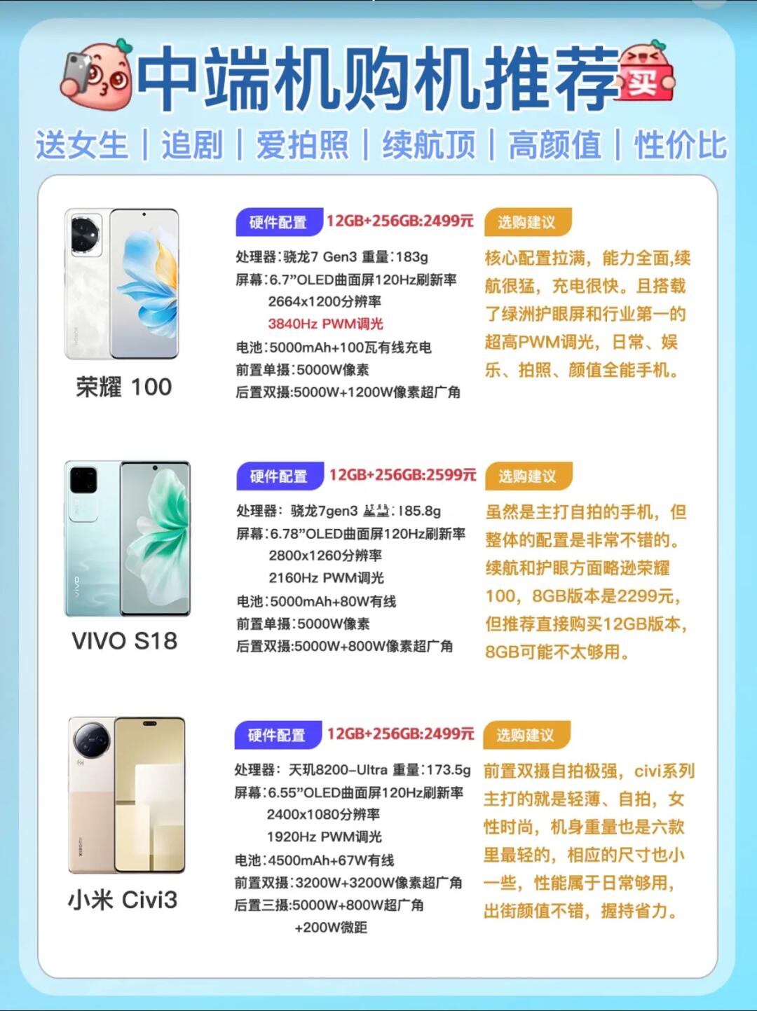 推荐:荣耀 100、VIVO S18、小米Civi3