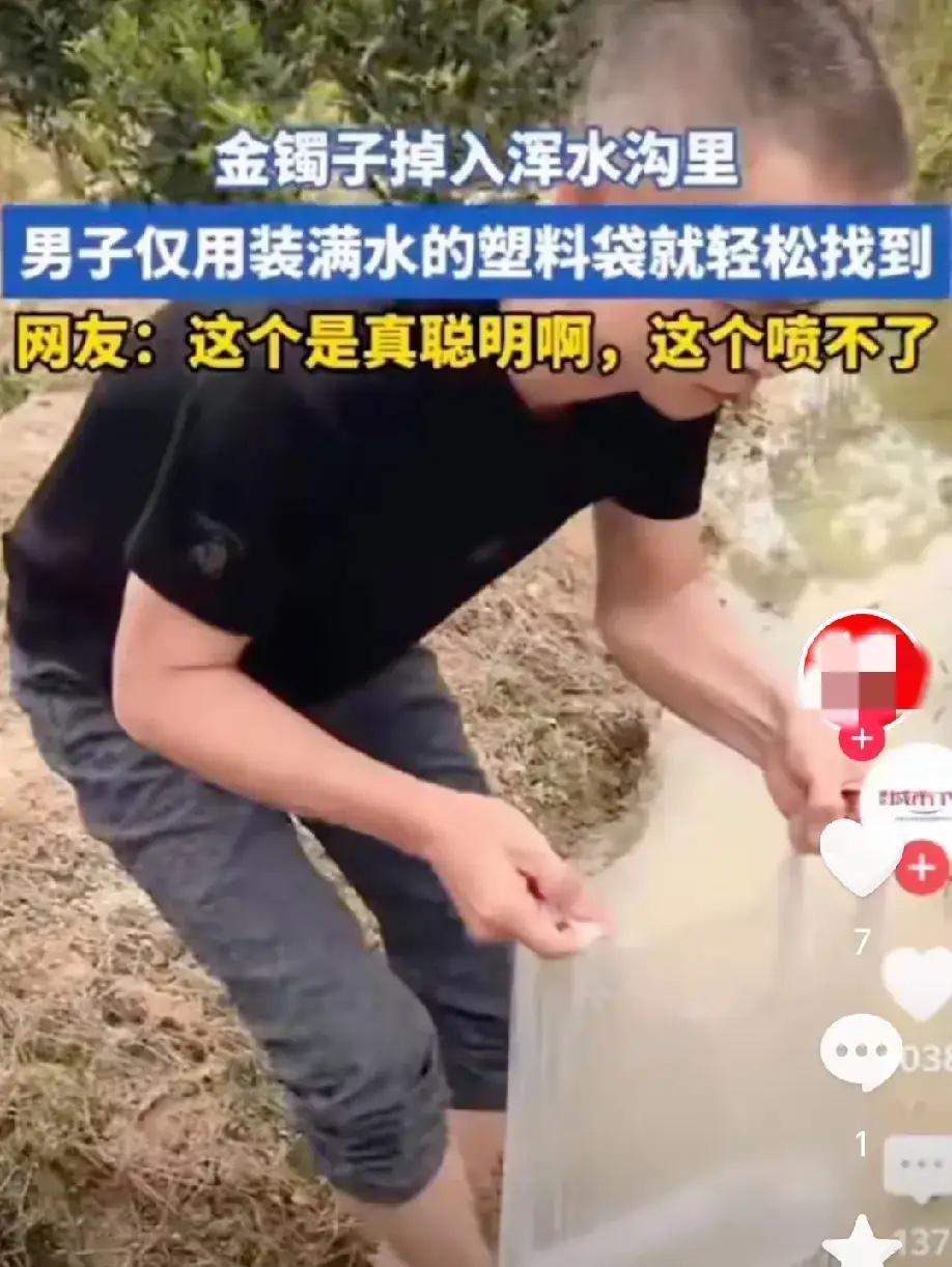 人怎么能聪明成这样?福建,男子不小心把金镯子掉进了水沟里,找了半天没找到,他又不想放弃,于是想出了一个小妙招,网友看后直呼聪明。 因为水沟水太混浊,所以他拿来一个装了水的塑料袋装满清水,放进水沟​神奇的是这个塑料袋就像一个探测仪,水沟底部看的清清楚楚。 蹲在水沟边的男子名叫陈大哥,这只金镯子是他和妻子结婚十周年的纪念物,当初花了三万多块钱不说,更重要的是承载着两人从恋爱到成家的回忆。那天他带着妻子去村里的菜园摘菜,镯子没戴牢,抬手摘黄瓜时“扑通”一声掉进了旁边的排水渠。水渠宽不到一米,可里面的水混着泥沙和落叶,浑浊得像掺了墨汁,伸手下去摸,除了冰凉的泥沙就是碎石子,连镯子的影子都碰不到。 陈大哥急得满头大汗,趴在渠边扒着石头找了半个多小时,手指都被碎石磨得发红,还是一无所获。路过的村民见状都劝他算了,“水渠里的水一直流动,镯子说不定早被冲到下游了,这么浑的水,就算在眼前也看不到”。可陈大哥不甘心,这镯子是妻子的心头好,平时舍不得摘,要是就这么丢了,妻子肯定会难过。他坐在渠边盯着浑浊的水面发呆,手里无意识地捏着一个刚装过菜的保鲜袋,突然想起小时候在池塘里玩水,把透明的瓶子装满水,透过瓶子能看清水下的小石子。 这个念头一闪,他立刻跑回家找了个厚实的保鲜袋,装满清水后扎紧袋口,小心翼翼地放进水渠里。刚开始角度没找对,看到的还是一片模糊,他慢慢调整塑料袋的位置,让袋面紧贴水面,顺着光线往下看——奇迹发生了!原本浑浊的渠底瞬间变得清晰起来,泥沙的颗粒、碎石的棱角都看得明明白白,在离他手边不到半米的地方,那只金灿灿的镯子正躺在两块石头中间,反射着微弱的光。 “找到了!真的找到了!”陈大哥激动得声音都发颤,赶紧伸手顺着塑料袋指示的位置摸下去,一把就攥住了冰凉的镯子。周围围观的村民都忍不住拍手叫好,有人拿出手机拍下这一幕,嘴里念叨着“这脑子也太灵光了,没想到这么简单的办法就能解决难题”。陈大哥擦干镯子上的泥水,看着失而复得的纪念物,心里的石头终于落了地,他笑着说:“当时就想着不能放弃,没想到歪打正着,这塑料袋还真成了‘寻宝神器’。” 这段视频传到网上后,很快就收获了百万点赞,网友们纷纷留言称赞陈大哥的智慧。有人说“生活里的小妙招都藏在急中生智里,换我可能早就放弃了”,也有人分享自己的类似经历:“上次钥匙掉下水道,我用矿泉水瓶装满水照着找,还真找到了”。还有科普博主解释,这个方法的原理其实很简单:浑浊的水沟里,泥沙和杂质会让光线散射,导致看不清水下物体;而装满清水的塑料袋相当于一个“透明窗口”,减少了光线的散射,同时水的折射率和空气不同,能让水下的物体成像更清晰,和简易潜望镜的原理有异曲同工之妙。 其实生活中很多看似棘手的问题,都藏着简单的解决办法,关键在于能不能沉下心来思考,不轻易放弃。陈大哥的经历之所以让人觉得温暖又佩服,不仅因为他用聪明才智找回了金镯子,更因为他对妻子的在意、对感情的珍视,让这个小妙招多了一份人情味。现在很多人遇到困难第一反应是焦虑、放弃,却忘了生活里的智慧往往来自于细心观察和灵活变通,就像这个装满清水的塑料袋,看似普通,却在关键时刻发挥了大作用。 更难得的是,陈大哥的小妙招还启发了不少网友,有人把这个方法用到了找掉在鱼缸里的小饰品、下水道里的小物件上,都取得了不错的效果。这也告诉我们,生活中的智慧从来不是凭空而来,而是源于对生活的热爱和对细节的关注,只要肯动脑筋,平凡的物品也能发挥不平凡的作用。 各位读者你们怎么看?欢迎在评论区讨论。