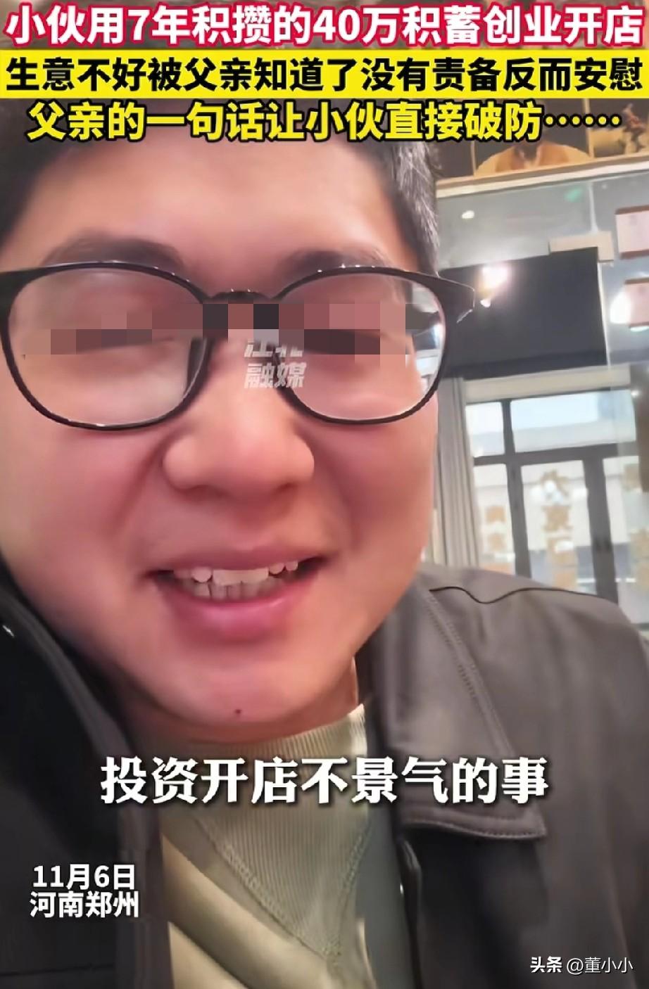 河南郑州,男子用7年的积蓄来创业,生意不好被父母知道了,他们没有责怪,反而还安慰男子,尤其父亲的一句话,直接让男子破防了。 原来,男子突然就想自己创业当老板,也看中了两个项目,一个棋牌室,一个台球,冲动之下就把婚后这7年积攒下来的40万全部都投资了。 但是,生意不咋地就连本钱都没有回来,生意不好也被父母知道了,父母就打电话过来没有责怪他的冲动,反而还问缺不缺钱。 男子并不想让父母担心,直接把话题引导了孩子身上,在他的意识里,家里有了孩子,一家人都会围着孩子转。 然而,接下来父亲的一句话,让他改变了看法,“你的孩子是你的事情,我跟你妈最心疼的永远都是我的儿子”,父亲的这一句话瞬间让他破防了。 此事引发了热议,有的网友表示,男人三十岁以后才发现,能关心你的问你缺钱吗,吃饭没,注意好身体,只有爸妈。 也有网友表示,我爸知道我要和朋友投钱,搞旅游。自己没多少钱,我没给他说,后来他知道了,他没打电话给我,他就默默的给我转了2万块钱,啥也没说,就让我好好做。 其实,人间最幸福的事是你到中年了,还有一声爸妈喊着,就珍惜吧。