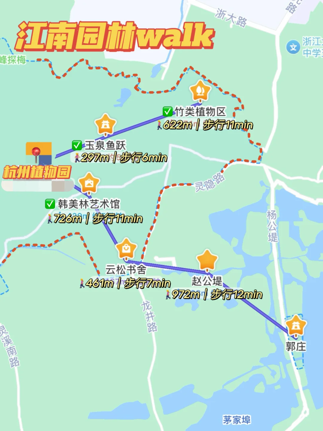 🗺路线:郭庄—赵公堤—云松书舍—杭州植物园(韩美林艺术馆—玉泉鱼跃—竹类植物区)