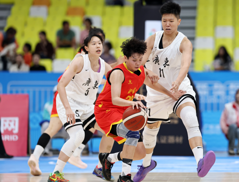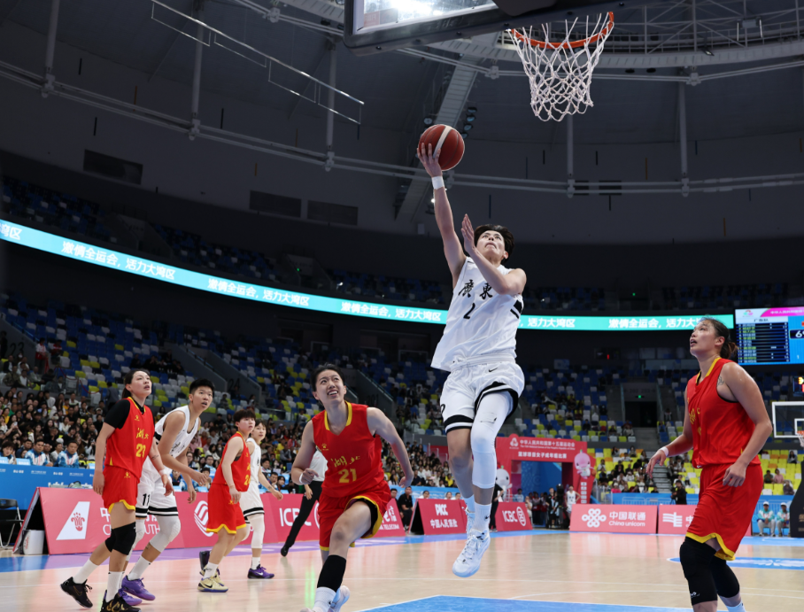 在佛山举行的第十五届全国运动会篮球女子成年组小组赛比赛中,广东队105比57战胜