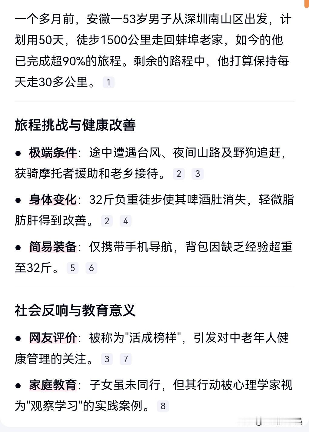 能干出这样的事情的,那基本上是没有什么压力的。 毕竟谁会没事选择徒步1000多公里回家。 11月8日(报道),53岁男子50天徒步1500公里回家。 说明这男子没有压力,所以才有这样大把的时间。 上热搜也已经说明起号成功了。 不过徒步对身体还是非常好的。 他的肚子都减下去了,收获也是不小。