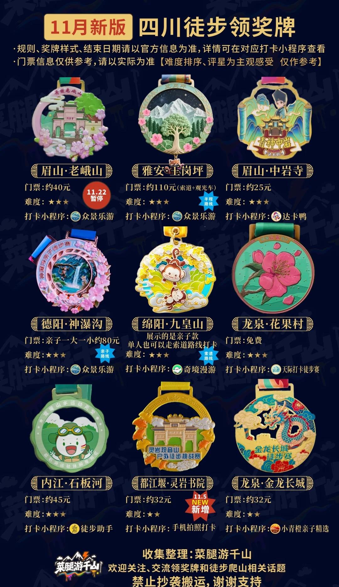 四川地区★11月版★徒步领奖牌合集 你们要的难度排序来了!轻松路线请往后面翻! 【图文是本人收集整理、排版设计】 【禁止搬运、禁止抄袭、禁止洗稿】 雅安:龙苍沟/牛背山/蒙顶山/王岗坪/喇叭河/碧峰峡 邛崃:天台山(所展示的奖牌是乐游天台不是达卡鸭的) 都江堰:灵岩书院 什邡:神瀑沟 绵阳:九皇山 龙泉:金龙长城/花果村(桃花故里) 眉山:老峨山/瓦屋山/彭祖山/中岩寺 乐山:峨眉山/背峰山/四溪沟 汶川:(阿尔沟已暂停) 汉源:孟获城/古路村 大邑:丁木沟 彭州:太阳湾/回龙沟 广元:剑门关/唐家河 宜宾:僰(bo)王山/仙峰山 巴中:光雾山 理县:甲尔猛措 内江:威远石板河 【重庆】金刀峡/金佛山/四面山/云阳龙缸/阿依河漂流/长寿湖/三峡之巅/三峡龙脊/龙桥河 【奖牌详细领取规则,可查看对应打卡小程序、抖音搜索、景区公众号等平台了解】 (不同景区,活动细则可能有变更,出行前另行了解实时情况) 成都爬山搭子 户外登徒步 爬山领奖牌 徒步的乐趣