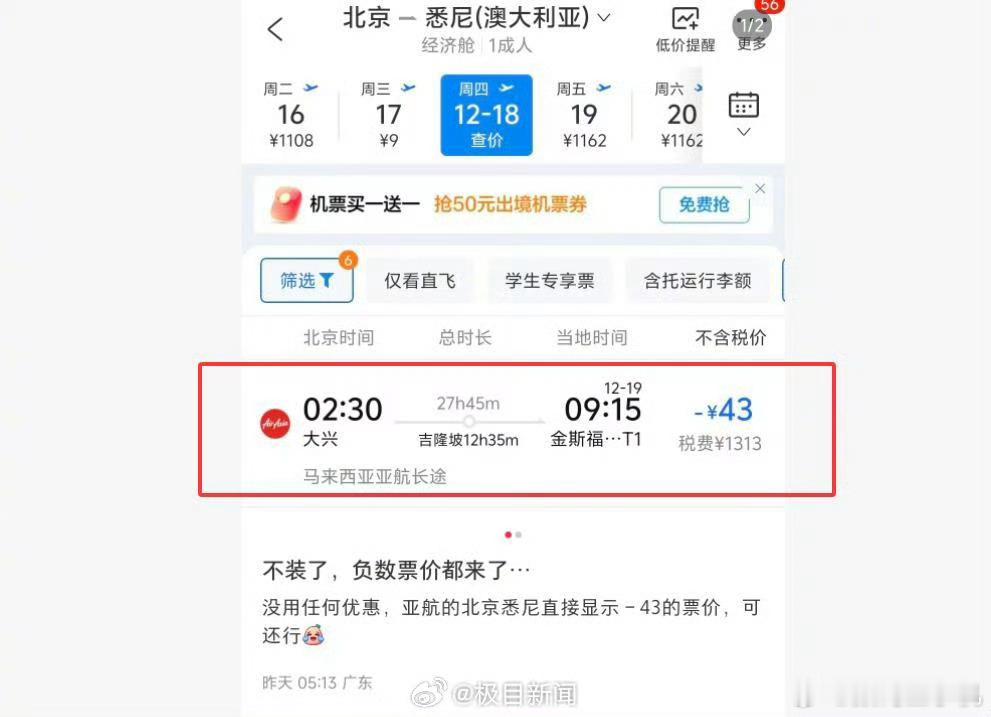 虽然票价是负数,但是税费要1000多,还要去吉隆坡中转十几个小时,岂不是可以在马来西亚转一圈,有时间有闲钱的可以去[憧憬]