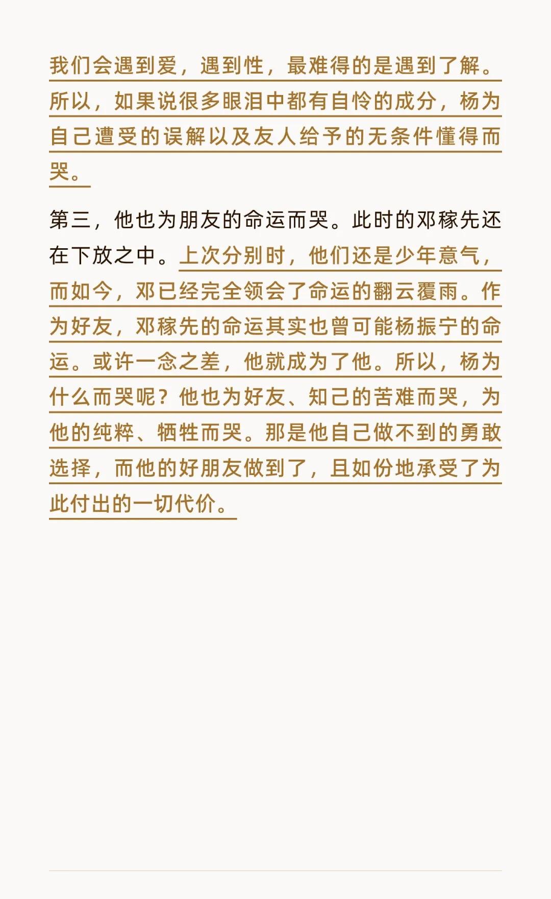 杨振宁的眼泪 大部分时候,杨振宁圆融、稳重、理性,不会有很强烈的情感流露,即算是公众对他的再婚、归国有诸多锐评之时,他也微笑礼貌应对,不急于解释,说要把这个问题交给时间。 但是,对于与邓稼先的往来,他有过强烈的情感流露。一次是在饭局上,有人将邓写的诗句(但愿人长久,千里共同途),交到他手中的时候,据回忆,杨振宁痛哭离席,到厕所重新整理才再次回到桌边。这可以说是我们目前知道的,杨少有的强烈情感流露。 杨与邓之间有着深厚的情谊。两人年少相识,后又在西南联大并肩求学。新中国成立后,他们的人生轨迹彻底分岔:一个留在美国,成为世界级的理论物理学家;一个毅然归国,将一生奉献于大漠深处的核武事业。1971年,杨振宁访华时,正是因为在探访名单上写下了邓稼先的名字,邓才得以提前恢复工作。后来,邓托人转交这封信,信末写着:“但愿人长久,千里共同途。”了解到这些信息之后,我的脑中就生出了一个问题,当时他究竟为什么而哭? 第一,我想,他为那份久别之中的深厚情谊而哭。隔着那么久的岁月,那么遥远的距离,杨回到了中国,他们短暂见面又分开,聚会中他收到来自邓的纸条,上面写着“但愿人长久,千里共同途”。这句诗,是几千年前中秋时节苏轼写给弟弟的词。以他们俩人的古典诗词涵养,邓从万千古诗词中选出了这一句,我想,杨振宁一定读出来了其中如哥哥牵挂弟弟一样的深厚情谊和美好祝愿。 第二,或许,他也为诗中的那份了解和懂得而哭。五六十年代,杨振宁选择留在美国,而邓稼先毅然归去。很多人认为,他们走在了不同的路上,甚至有人批判杨的选择圆滑精明。然而,作为朋友的邓嫁先,用“千里共同途”说出了自己对朋友不同选择的全部懂得与理解。有句话说,我们会遇到爱,遇到性,最难得的是遇到了解。所以,如果说很多眼泪中都有自怜的成分,杨为自己遭受的误解以及友人给予的无条件懂得而哭。 第三,他也为朋友的命运而哭。此时的邓稼先还在下放之中。上次分别时,他们还是少年意气,而如今,邓已经完全领会了命运的翻云覆雨。所以,杨为什么而哭呢?他也为好友、知己的苦难而哭,为他的纯粹、牺牲而哭。那是他自己做不到的勇敢选择,而他的好朋友做到了,且如份地承受了为此付出的一切代价。纪念杨振宁教授 杨振宁 邓稼先 诺贝尔奖