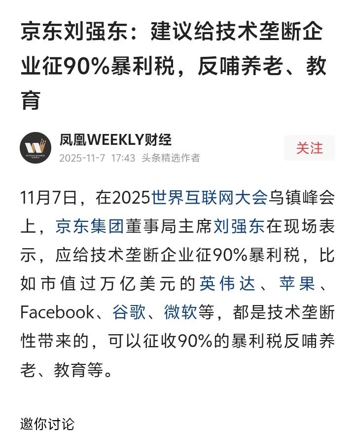 刘强东乌镇发言引爆全网:向万亿科技巨头征收90%暴利税 这笔钱能改变多少普通人的命运? (来源:凤凰WEEKLY财经) 当刘强东在乌镇峰会上提出“向技术垄断企业征收90%暴利税”时,他撕开了全球资本狂欢背后的一道裂缝。苹果、谷歌、英伟达——这些市值万亿的科技帝国,靠技术壁垒攫取着普通人难以想象的财富,而养老金的缺口、教育资源的匮乏,却成了无数家庭的隐痛。这句话像一颗投入湖面的石子,涟漪从会场蔓延至街头巷尾。 一位东北网友的留言被顶上了热搜:“285元的羽绒服穿了二十年,如今千元难求一件真羽绒。”这不仅是关于价格的抱怨,更是对时代变迁的无声控诉。当科技巨头用算法收割利润时,普通人连一件保暖的衣裳都要权衡再三。技术的进步究竟该让谁受益?刘强东的提案,戳中了这场沉默对峙的核心。 有声音质疑:“为何不先对国内垄断企业开刀?”但问题的本质或许更深——技术垄断已超越国界,成为全球性资源分配失衡的推手。当一家公司靠芯片设计赚走行业80%利润,当社交平台用数据霸权捆绑用户生活,暴利背后是无数中小企业的生存空间被挤压,是创新土壤的逐渐板结。 翻看评论区,一位山东用户的感慨引发共鸣:“十几年前的李宁羽绒服仍能机洗如新,如今高价商品反而质量缩水。”这种对比背后,是资本追逐短期利益与长期社会价值之间的撕裂。技术本应让生活更普惠,但当它沦为垄断工具时,连一件衣服的“性价比”都成了奢侈。 也有理性声音提醒:征税不是目的,而是重构公平的杠杆。如果万亿税款能流入农村养老院、山区教室、基层医疗,科技发展的红利才能真正润泽社会的毛细血管。这并非仇富,而是追问——当少数企业坐拥金山时,是否该为铺路的人留一盏灯? 值得注意的是,刘强东将养老与教育列为反哺重点。在老龄化加速的今天,无数家庭正为父母医疗费辗转难眠;而教育资源的内卷,早已成为年轻人肩头的大山。科技巨头的税收若能填补这些洼地,或许能缓解一代人的焦虑。 但争议从未停止。有观点认为,高额征税可能抑制创新活力。然而历史告诉我们,健康的市场需要规则而非野蛮生长。正如一位网友犀利评论:“如果技术垄断连暴利税都不愿承担,又何谈推动社会进步?” 这场讨论早已超越财经领域,成了价值观的博弈。当我们在深夜刷着手机,享受科技便利时,是否想过——这些便捷的背后,是谁在承担成本?又是谁在透支未来? 刘强东的提议像一面镜子,照出了科技光环下的阴影区。或许我们真正期待的,不是一个简单的征税方案,而是一次关于财富分配、技术伦理与社会责任的全民觉醒。 尾声:乌镇的水声依旧潺潺,但互联网的潮水已涌向更远的堤岸。这场关于技术垄断的辩论,终将书写下一个时代的注脚——科技的终极使命,究竟是堆砌少数人的神话,还是温暖大多数的人生? 刘强东 乌镇 发言 引爆全网 科技垄断 财富分配