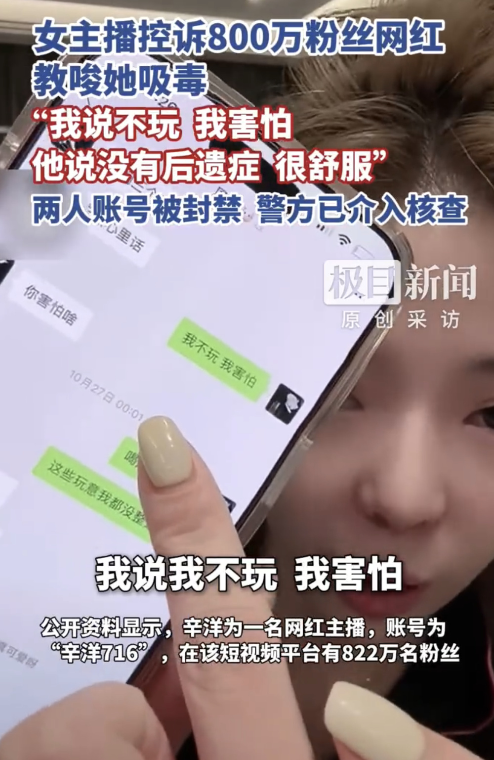 公开资料显示,辛洋为一名网红主播,账号为“辛洋716”,在某短视频平台有822万名粉丝。直播录屏视频中,“可意妹妹”称事发已有一周,公司没有相关解释。“可意妹妹”还展示了聊天记录,聊天记录显示她曾表示害怕,对方则告诉她“没有后遗症”。