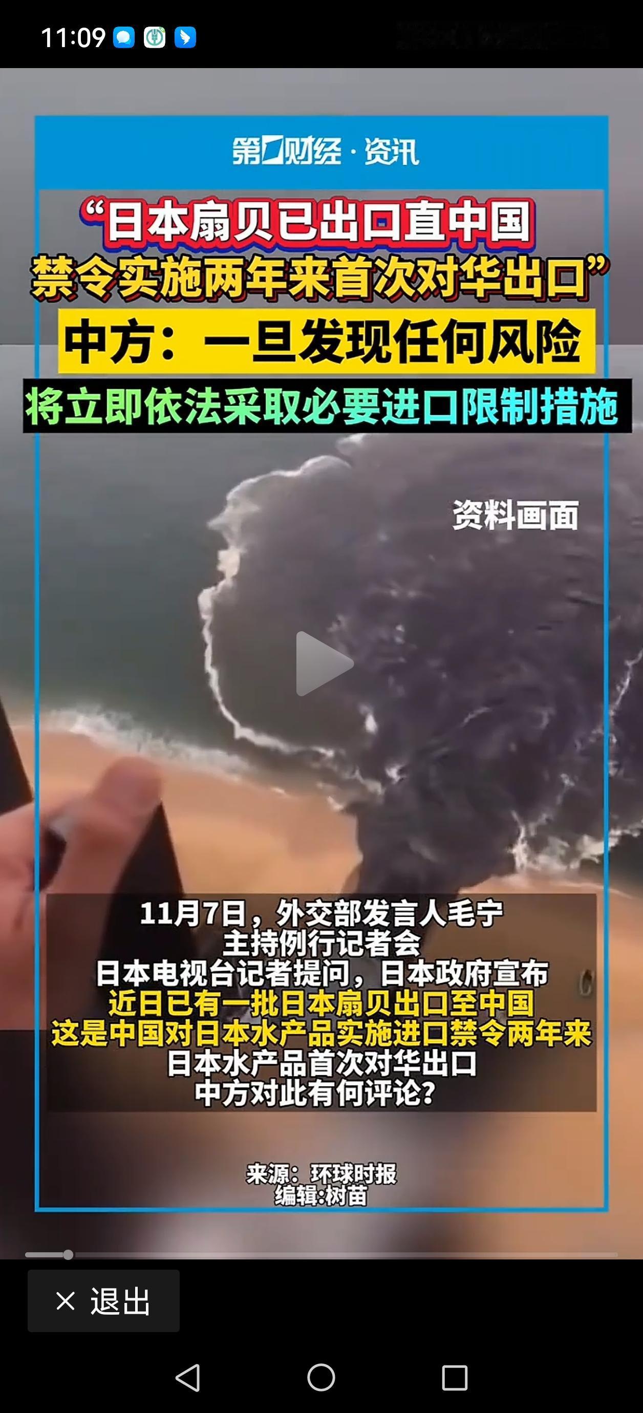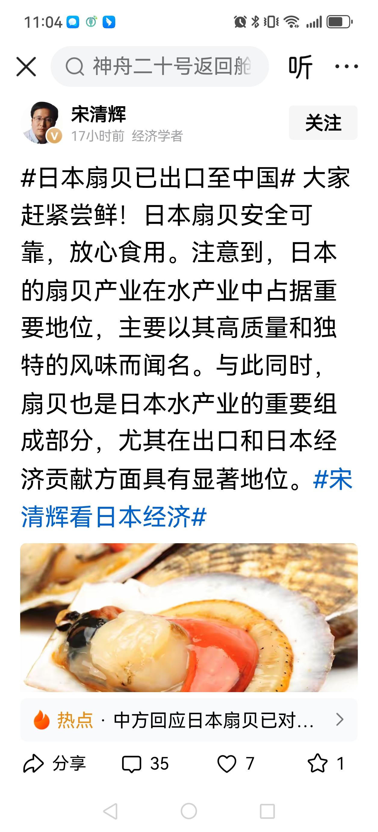 你会吃这种海鲜吗? 一方面,时隔两年后,我国再次进口倭国海鲜,首批6吨冰冻扇贝已达我国。请注意,是冰冻的。 一方面,倭鸨高什么苗继续大放厥词,“台海有事,日本有事”。 这样的海鲜你吃得下吗? 反正我是不会去吃的。 但是,想吃的人还是有的,你看这位宋经济学家,欢呼雀跃,舔态毕露,迫不及待当起了推销官。什么货色大家一眼可知了吧。