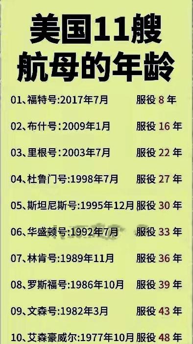 美国11艘航母的年龄,核动力真能用半个世纪。 福特号,服役8年。 布什号,服役16年。 里根号,服役22年。 杜鲁门号,服役27年。 斯坦尼斯号,服役30年。 华盛顿号,服役33年。 林肯号,服役36年。 罗斯福号,服役39年。 文森号,服役43年。 艾森豪威尔号,服役48年。 尼米兹号,服役50年。 美国现在有11艘航母,全部是核动力,最老的一艘是尼米兹号,服役至今刚好50年整,也就是半个世纪,但根据美媒报道,这艘航母将于2026年退役,届时就剩下10艘航母。 别看老美航母多,实际上大部分都在停在港口,通常只有4艘处于部署状态,而只有其中的2艘处于航行训练状态。虽然核动力航母不需要经常加注燃料,但航母使用年限已经很长,很多零部件需要更换和保养,费用巨大,让负债37万亿美元的美国越来越吃力。 别看老美一年的军费相当于第二名到第九名国家军费的总和,实际用到海军维护上的钱很少,这并非空穴来风,看看美国航母故障频发就知道怎么回事。特别是杜鲁门号,实际上这艘航母已经废了,8个月前在苏伊士运河与一艘5万吨货船撞了,撞出一个大窟窿,至今没有修好。另外大家也知道,前几天老美的另一艘航母在南海又摔了一架战斗机和一架直升机。更无语的是,美国最新福特号航母的电磁弹射也经常出现故障。 老美的航母早已经严重失去威慑力,坏的坏修的修,只能说多行不义必自毙,谁让你动不动就开着航母去别国海域逛来逛去。美国的航母霸权就剩下一副空架子,打也门都要先把航母开得远远的,真是三十年河东三十年河西啊。
