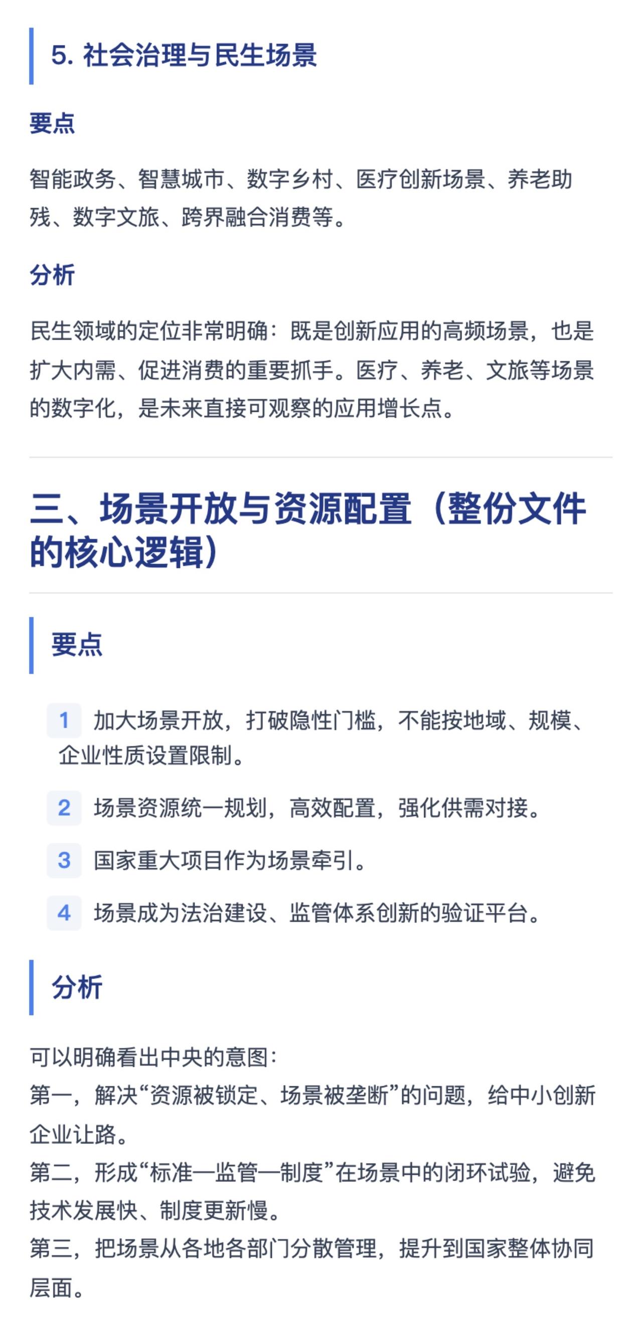 这个政策值的看一看,十五五规划后的第一个文件,场景太多,就拿我熟悉的聊一聊...名字有点长:《关于加快场景培育和开放推动新场景大规模应用的实施意见》。 我看完之后的第一反应是:我们,真的要进入“验证驱动时代”了。 过去二十年,中国的创新模式很简单:靠技术、靠资本、靠市场体量;但最近几年,技术太多,落地太少;创新够多,验证太难。 AI 是这样,新能源也是这样;实验室里能跑通的,社会里却不能规模化。所以,智远觉得,这份文件,是在解决这个「系统级卡点」。 它的逻辑非常清晰: > 从「项目驱动」到「场景驱动」,从「扶持产业」到「重构机制」。 国家除了给资源,也开始给「机制」了,搭框架、定规则,让创新能自由流动、被真实验证。 文件里最打动我的是那22类重点场景;从智能制造、智慧交通,到社会治理、民生服务。 其中有一条离我关注的赛道很近:推动新技术应⽤,创新智能交通管理、车联⽹、智能调度等应⽤场景,优化城市交通结构,开拓国际航班空运过境。 听起来有点抽象,但举个例子你就懂了。 比如萝卜快跑,它像一座城市交通系统的实验场;能识别红绿灯、行人、信号干扰等;后台在毫秒内同步上万辆车的路径。 所以,它在验证的,不只是技术能不能跑,而是城市能不能学会协同。 我还想到一个老例子:乌镇。这两天世界互联网大会,每年开大会都有人拍到那段视频:空调外机贴着水面,但下大雨从不被淹。 因为整个水系早就数字化了。 系统能自动判断雨量、水位、流量,自动调度闸门;这,就是「行业治理」的升级版:让数据自己说话,让系统自己决策。 还有一类是「民生与消费场景」。这两天小鹏的人形机器人出圈了,我就在想,以后是不是能陪孩子学习,帮老人端水? 所以,这份文件,本质上是在加快场景的开发,让技术真正走进场景、走进生活。一句话总结就是: 中国,正在从“创新驱动”,进入“验证驱动”。 反正内容挺多,我理解的不一定全面。但如果你关心未来几年企业的增长方向,这份文件,值得认真看一看。