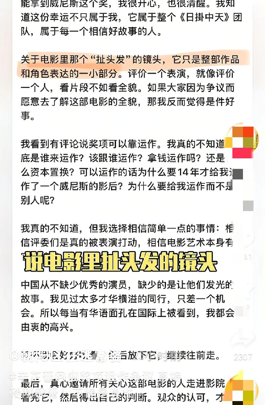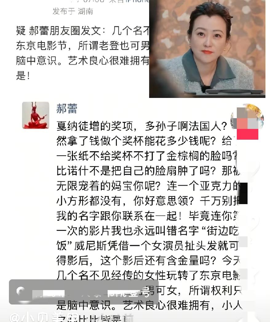 这两天的瓜瓜 当面嘲讽, 背后互怼 所谓的艺术良心,成了撕X的武器,就说这圈子的体面还剩多少? 辛芷蕾发长文硬刚郝蕾,起因是郝蕾在朋友圈说,威尼斯凭借一个女演员扯头发就可以得到影后。 随后辛芷蕾发长文说电影里扯头发的镜头只是整部电影里编码的一小部分,并说如果奖项可以运作的话为什么14年才给他运作了一个威尼斯影后。 这波性质的火速回应,不愧是真性情呀。本来就是,如果威尼斯以后影后那么好拿的话,为什么郝蕾没有一个呢? 这波我站辛芷蕾,毕竟没有过硬的演技,咋可能得到大导演的认可,大家说是吗? 你觉得这事儿到底是真性情,还是借题发挥?来评论区聊聊~辛芷蕾 辛芷蕾演技 辛芷蕾白玉兰 郝蕾 演技 娱乐圈