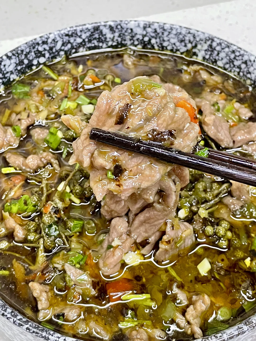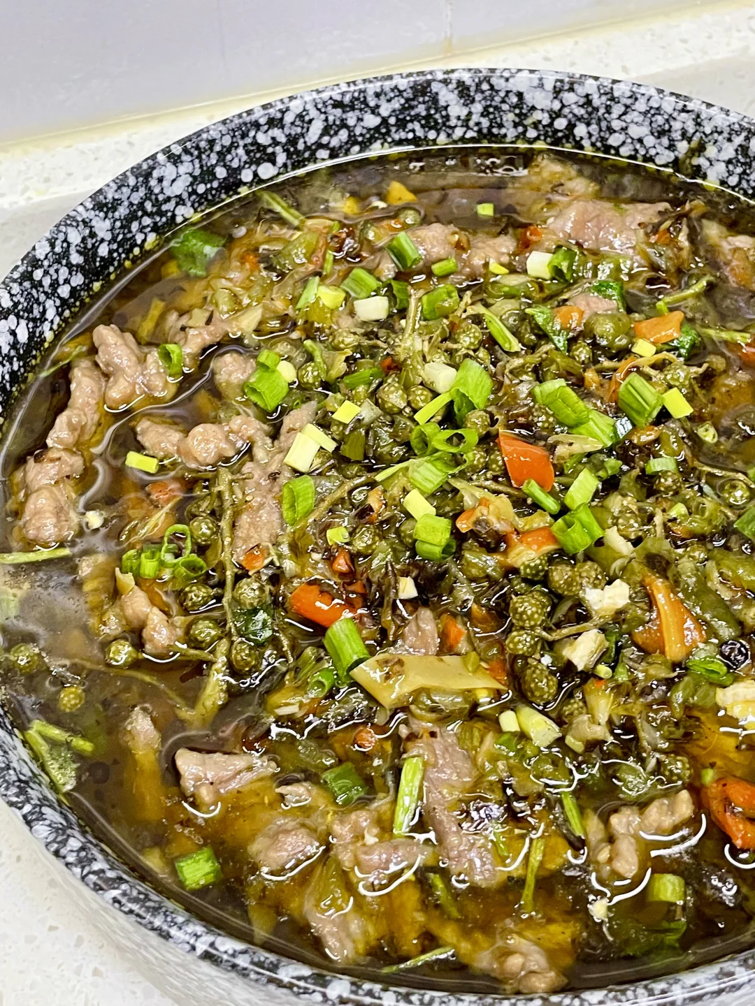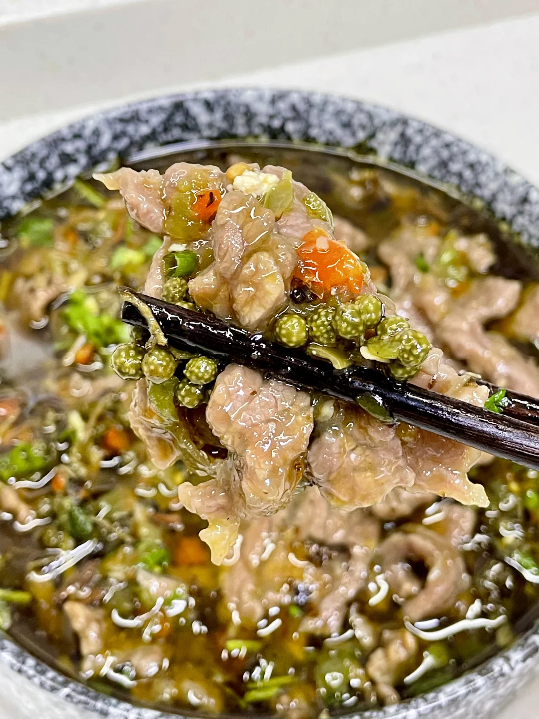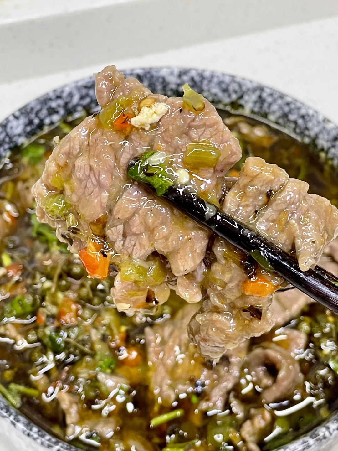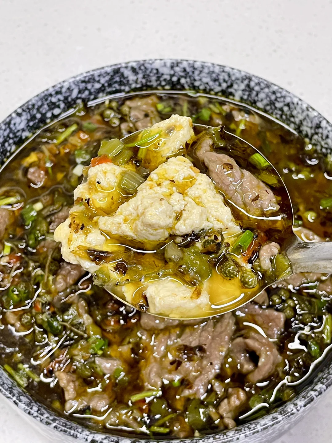巨巨巨下饭的烧椒豆花牛肉,椒麻鲜嫩,牛肉嫩滑,豆花入味,加了点新鲜的青花椒,味道更上一个层次,唯一的缺点就是太费米饭了🍚 1️⃣:牛肉切片,加入盐 生抽 胡椒粉 水淀粉抓匀备用 2️⃣:锅中少油少盐润锅,放入二荆条炒至虎皮状发黑状态剁碎备用,油热倒入姜蒜 青花椒爆香,加入烧椒炒香,加入清水烧开,调味加盐 生抽 胡椒粉熬煮个四五分钟 3️⃣:放入豆花煮入味,再转小火放入牛肉煮定型,转中火煮半分钟,加入少许鸡精,撒上葱花香菜即可