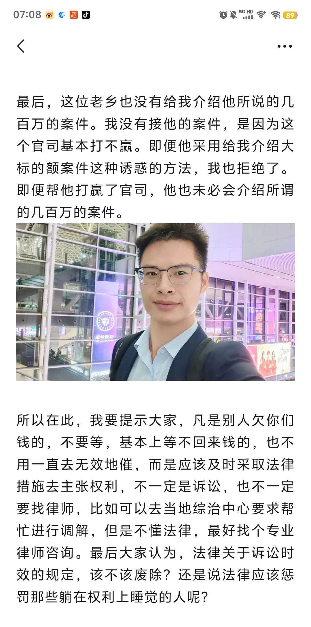 我就直接告诉他,你这个案件基本打不赢。我的理由有两条:第一,我说他这个案件已经过了三年的时效;第二,对方是老板,不回复你信息,不接你电话,说明他身边有律师朋友,早就咨询好了,你如果起诉他,他一定会主张时效抗辩。所以告诉他,他的案件接不了,已经过了时效了,我没法接!