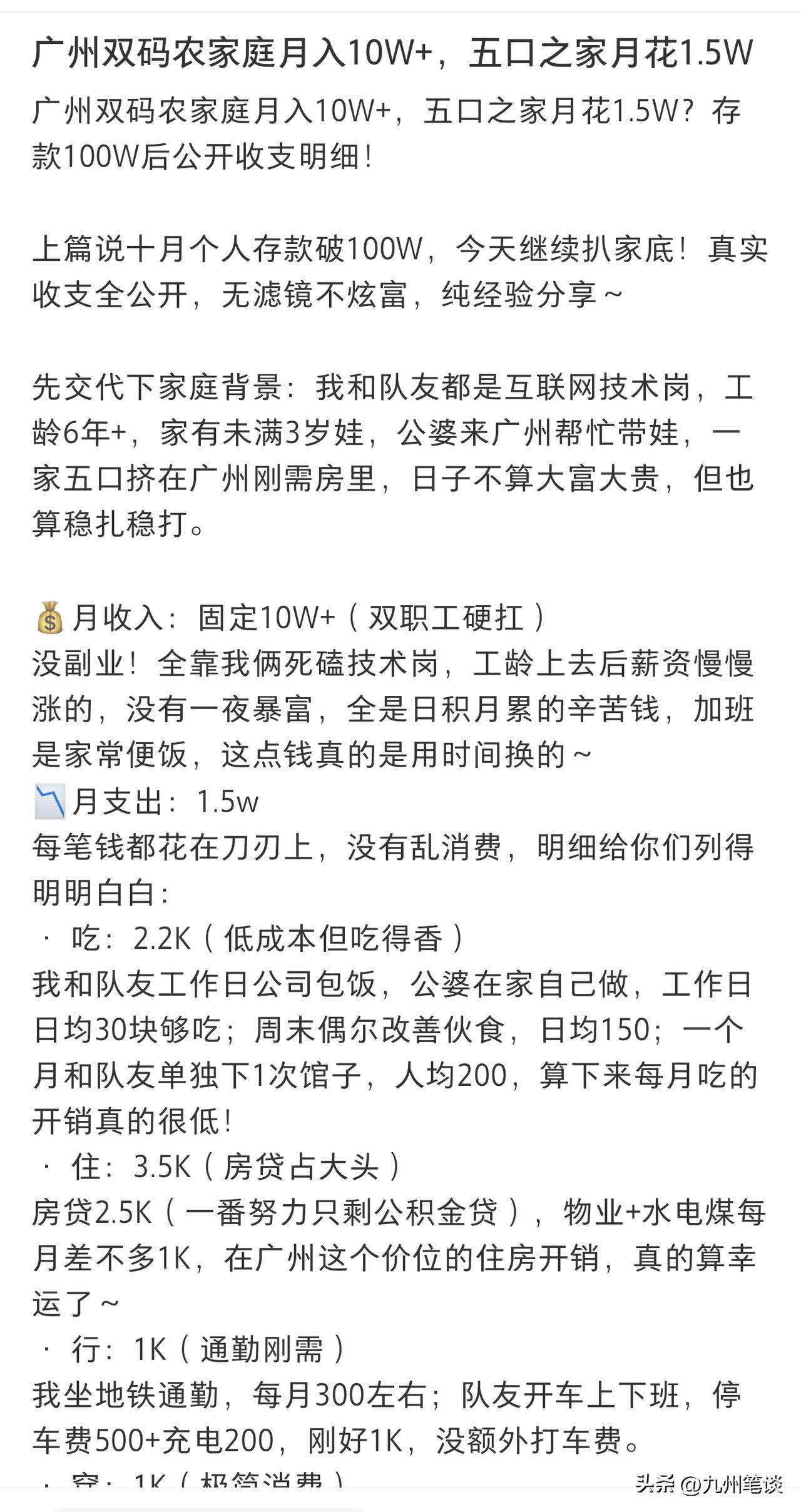 用知识武装自己,90后小镇姑娘“攻陷”广州,实现本地化,占有一席之地! 广州双程序员夫妻月入10万➕,有车有房有娃有百万存款。 90后小镇青年强势扎根广州,用知识打败了95%的广州土著80后、90后。 90后小镇女青年,985硕士研究生毕业,算法工程师,年度综合月收入5万➕,夫妻两个收入10万➕。靠的是主业,没有额外副业收入。 90后夫妻不但换了房了,还提前还清了商业贷款,手上的资金已经超过了7位数。 绝对是广州前10%的90后。 其实广州人也有这样努力甚至更努力的人。 只是占比很少很少。 像美籍华人某米的联合创始人林先生,就是广州人。初中高中都在广东省实读书,大学读的是广州的中大,然后又去了大漂亮国,后又回到中国创业,现在身价超百亿美金。 他在去80年代读中学时,得益于优渥的家庭条件,就拥有了自己的个人电脑。他母亲去美国出差时,就为他带回来了一台电脑。加上个人努力,实现了现在的梦想成真。 现在百亿美元身家,是来自广州的最有钱的IT精英了。 其实中上层人士,眼里不局限于一城一市,他们是面向全世界的地球人!哪里对自己的发展有利,就去哪里!哪怕万里之遥,大洋彼岸。 而大部分广州学生,却无法入读985,211高校,甚至都普通大学的也不到一半。 更需要家长从小严格教育孩子,避免自家孩子成后后一半,负起做父母的责任。毕竟家里有几栋楼的土豪只是核心地段的城中村。不如广州人口的1%。