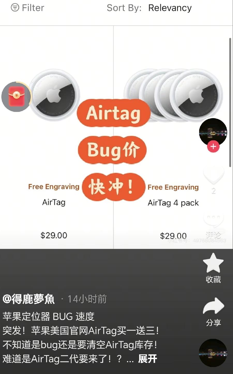 苹果官网又闹乌龙!4个装的AirTag,价格居然和单只一样,网友直接抢爆了! 这波便宜不占白不占!苹果美国官网这次闹了个大乌龙,4个装的AirTag,价格标得和单只一模一样,一下子就把大家的购买欲点燃了。现在订单多到发货时间都排到12月份了,第一批手快的人已经收到货了,后面下单的朋友,说不定订单会被取消呢。 大公司也会犯这种小失误吗?其实苹果出现价格乌龙也不是头一回了。之前耳机价格标错的时候,也被大家瞬间抢光了。这次的情况更离谱,4个装的价格等于单只,相当于白送三个,难怪网友们都说“捡到就是赚了”。 不过话说回来,这种BUG价格到底值不值得入手呢?有人觉得捡这种便宜是应该的,也有人怕后续售后出问题。大家觉得呢?要是你遇到这种情况,会不会直接下单呢?