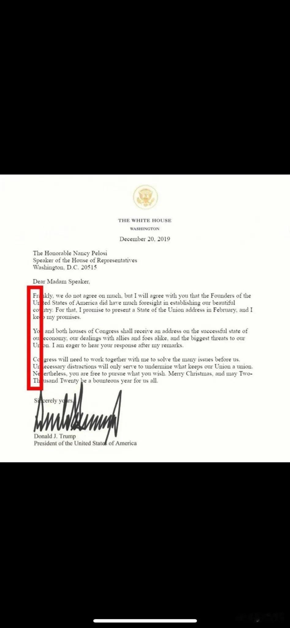 佩洛西要退休了,特朗普第一时间发推痛骂:“南希·佩洛西,那个老态龙钟、政治手腕败露的政客,两次弹劾我都失败了,现在终于要‘收手’了。她在股市非法敛财,欺骗美国民众,给美国带来了灾难。我很高兴看到南希·佩洛西的恶臭终于消失了!” 让特朗普大方祝福,那是万万不可能的。 看美国社交媒体,人们还扒出据说特朗普2019年第一任期时致佩洛西的圣诞贺信。 贺信中规中矩,但最有意思的,是每行的第一个字母,连起来是一句非常粗俗的脏话:操你的…… 哈哈,可能是网友恶搞,但也可能是真的。这个世界,针眼对绿豆,恶人自有恶人磨吧[笑哭]