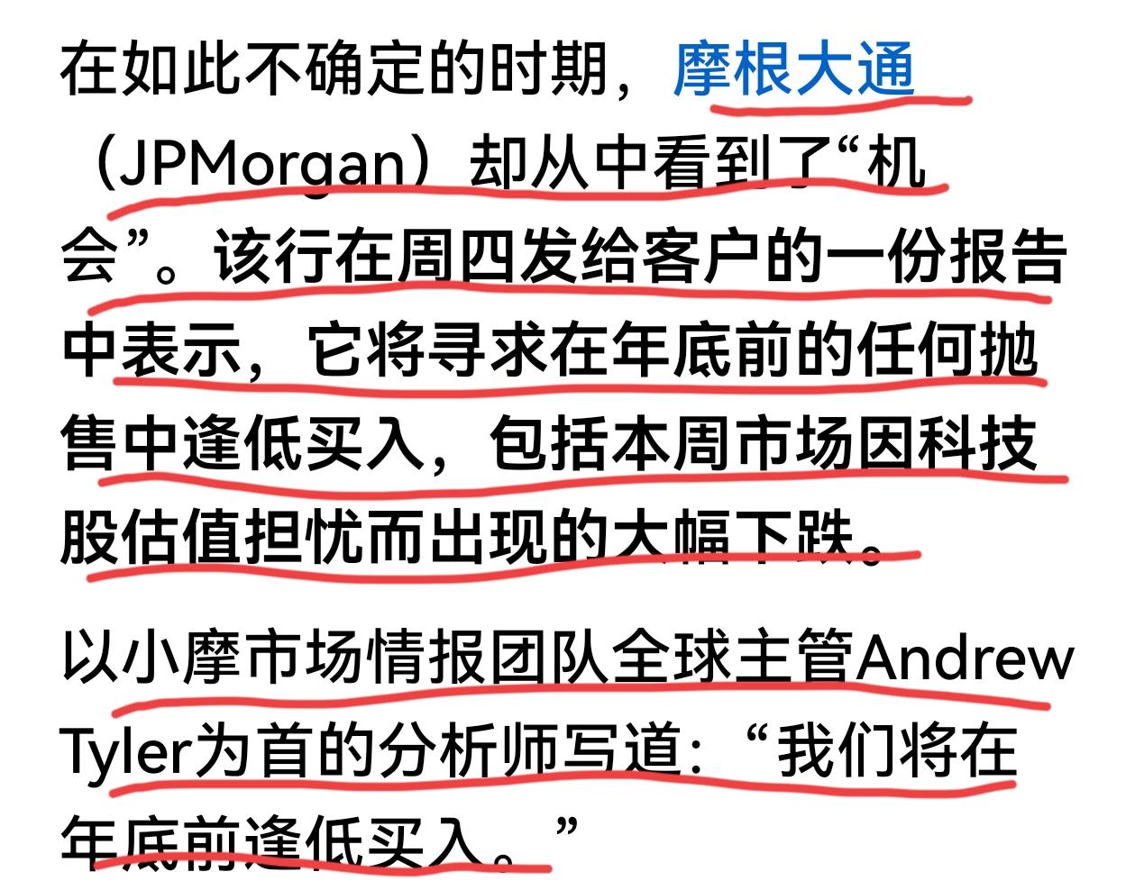 美股行情如何演绎,摩根大通与众不同,表示逢低买入。不少机构警告美国市场高估值值得担忧,唯有摩根大通从中看到机会,寻求在年底前的任何抛售中逢低买入,其分析师团队表示“我们将在年底前逢低买入”。 关于美股高估值尤其是科技七巨头,关于AI泡沫的讨论很多,高盛、摩根士丹利等都有警示,美股可能在未来出现动荡,在12到24个月内出现较大幅度的回调,这是较为普遍的观点。但是摩根大通特立独行,近期很少有看多的观点,摩根大通就是这个少数派,但其观点也是有依据支撑的:美国经济强劲,招聘开始企稳;企业盈利强劲,标普500成分股中83%的公司10月底报告业绩超预期;主要不利因素在消退,贸易战“解冻”,达成了更多贸协议。 作为全球最具影响力的市场,美股的涨跌还是很引人关注的,对A股的情绪影响也不小。近几天美股因 Open AI 财务官失言引发调整,周五又因政府停摆问题可望解决而V型反弹。有时候真理掌握在少数人手中,你认同摩根大通的观点吗?