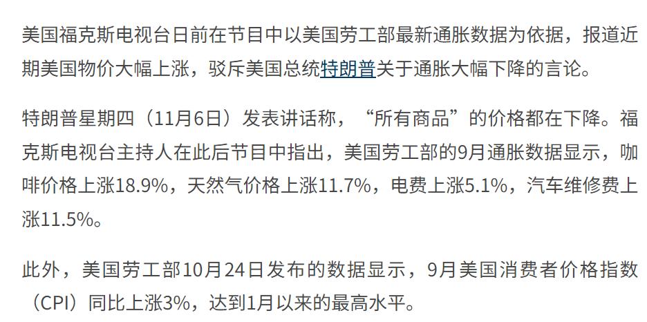 特朗普这一次被美国媒体给打脸了。 11月8日,联合早报报道说,特朗普最近发表讲话时,竟然说现在美国所有商品的价格都在下降,这个言论一出,福克斯电视台等美国媒体,立刻就以美国劳工部亲自发表的统计数据作为依据,有力驳斥了特朗普这个言论,使得特朗普惨遭打脸。 根据福克斯电视台的报道,现在美国国内物价上涨其实非常严重,比如说在9月份,“咖啡价格就上涨了18.9%,天然气价格也上涨了11.7%,电费更是上涨了5.1%,汽车维修费也上涨了11.5%”,等等,基本上各类商品的价格,就没有不上涨的,美国普通民众早就因此苦不堪言。 而且这还不是最为严重的一个问题,更加严重的问题在于,物价上涨的同时,美国联邦政府提供的各种福利保障也在减少,比如说最近美国就暂停了“补充营养援助计划”,这个援助计划覆盖美国八分之一的人口,是很多美国穷人的重要生存来源,可是现在在却已经停止; 除此之外,还有“妇女、婴儿和儿童特别营养补充计划”、学前教育项目“启蒙计划”等等一系列社会福利保障,也开始陆续叫停。 与此同时,在物价上涨、各种社会福利保障措施减少的大背景之下,现在美国人的工资也在不断下降,就业率也在不断降低,甚至就连硅谷这样的地方,那些科技巨头也开始裁员,比如说前段时间英特尔就裁员了3.39万人,微软也裁员了1.92万人,还有其他企业诸如亚马逊、IBM、meta等公司,也都不断裁员。 所以说,现在美国普通民众面临的情况是非常糟糕的,工资下降、就业率降低,导致自己挣到的钱越来越少,然后在挣钱越来越少的情况下,物价还在不断上涨,通货膨胀非常严重,这简直就可以称得上是雪上加霜了,美国普通人的生活水平在这段时间可谓是断崖式的下降。 特朗普一直想要把自己塑造成为一个胜利的形象,可是这些冷冰冷的无比现实的统计数据却是说明了一切,那就是他的各项措施并没有让美国变得更好,反而是更加糟糕了,也正是因此,这一次美国媒体才能够以翔实丰富的统计数据,直接狠狠打了特朗普的脸,还让特朗普没法子反驳,毕竟这些问题都是切实存在的。 深入分析这一个新闻,其实就可以从中窥见现在特朗普的处境,以及他未来可能的应对。特朗普的处境,现在毫无疑问是非常糟糕的,如果不能尽快解决美国国内这些问题,其支持率将下降,其政治地位也将受到巨大挑战;而想要解决这些问题,毫无疑问靠之前那种简单粗暴的加征关税的办法,是肯定做不到的了。 因此,接下来特朗普的对外策略,想都不用想,肯定会越来越“柔和”,越来越“妥协”,因为他已经承受不起强硬的代价!