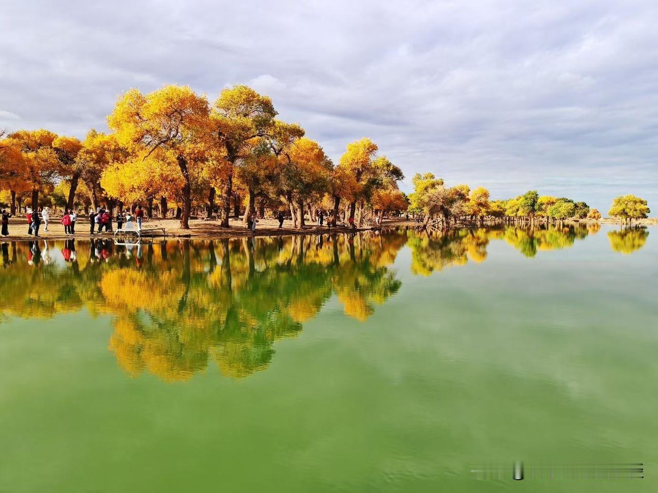 秋日漫步,金黄树影倒映在碧绿湖面上,美不胜收!