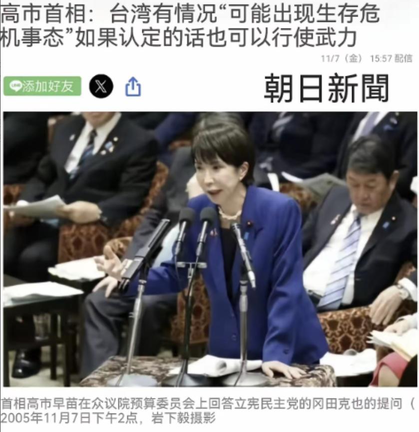 重新界定“台湾有事”! 据日媒报道:高市早苗称,倘若台海出现“涉及动武的状况”,比如解放军对台岛实施封锁,她觉得这可被视作“对日本构成了生存威胁”。届时自卫队一定会诉诸武力。 甲午战争后,日本占据台湾五十年,把台湾当作自己在东亚落脚的重要地方。这些往事,并没有因为时间流逝而在日本政坛彻底过去。 相反,只要台海局势稍有波动,这股历史情结很快就会浮出水面,成为一批日本政客口中的紧要话题。 他们嘴上打着安全旗号,内心里却总是想着不要让中国真的把台湾完全收回去。有些人甚至认为,一旦两岸统一,日本在东亚就只能靠边站,这样的现实让他们坐立难安。 为了守住自己在地区的话语权,日本这些年在台湾没少下功夫。日本早就用大规模投资把自己和台湾的产业、企业紧紧捆在一起,不少台湾重要企业都有日本资本的身影。 只要台湾经济一出现点情况,日本往往都能马上介入影响。除了钱上的来往,日本还利用动漫和媒体影响台湾民间情绪,从流行文化到新闻报道都下了不少功夫。 表面上是文化交流,其实是借机让台湾社会对日本多点亲近感,这招很隐蔽,但长期看确实起到了作用。 不少人把注意力放在美国身上,觉得美国才是台海局势背后的导演。这么说没错,美国对台湾的态度确实强硬,经常趁台海风向大做文章。 不过美国更多是按着全球战略考虑,真遇到大事还得算账,掂量利弊,不会轻易下场。跟美国这种大棋局思维不同,日本对台湾显得特别执着。 这种执念不只是一种安全担忧,更多掺杂了历史、利益甚至心理因素。一旦觉得自己可能被中国比下去,日本政坛里那些主张强硬的声音准会跳出来。 日本近年来不断加大防卫预算,扩军的话题也公开讨论,和平宪法里的限制,他们现在试探得越来越大胆。不仅如此,日本还把防卫政策同台湾问题直接挂钩。 像高市早苗这样公开喊话,已经说明他们为动用武力提前做铺垫。一旦台海有风吹草动,日本都生怕被边缘化,试图用各种手段在话柄和现实动作上提前为自己留后路。 其实现在的中国,和过去早就不是一回事。中国推动统一有自己的步调和底气,不会因为外部几句言论或者小动作就停下来。 日本再怎么拿过去的恩怨说事,也改变不了现实趋势。只要中国慢慢推进统一,日本能做的其实非常有限,最终还是要面对全新的东亚格局。 未来局势怎么变,主动权都越来越掌握在中国手里。这些年日本展现出的紧张和小心思,说到底不过是对即将到来的变化难以适应而已。