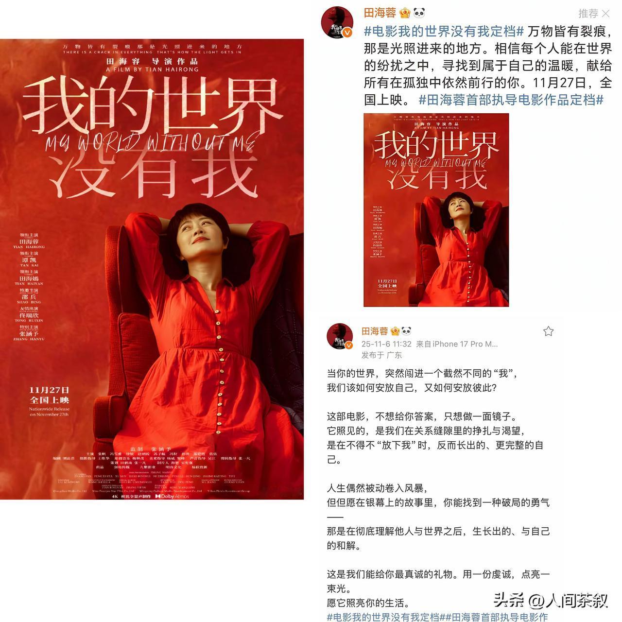 田海蓉这部新电影 《我的世界没有我》海报红的真热烈 11月27又要上映了 这部电影是她导演并主演 可是导演那里为什么是写“田海容” 主演那里又是“田海蓉” 领衔主演里还有个叫“田海嫣” 是她亲妹妹吗? “万物皆有裂痕, 那是光照进来的地方” 写的真好啊 我们也希望世界所有黑暗的地方 都能找到这样的裂痕 让光照进去 大家喜欢这部电影吗