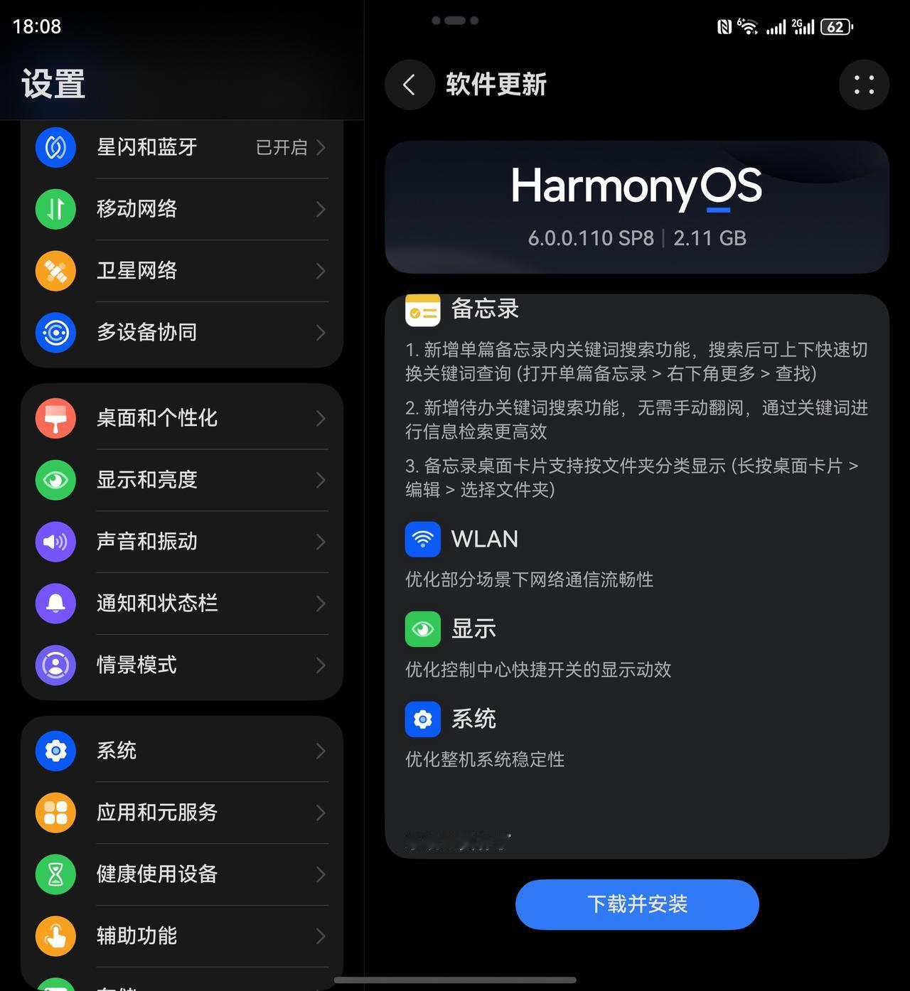 鸿蒙6公测版又有更新了,版本号6.0.0110SP8,小艺、图库、备忘录都有多