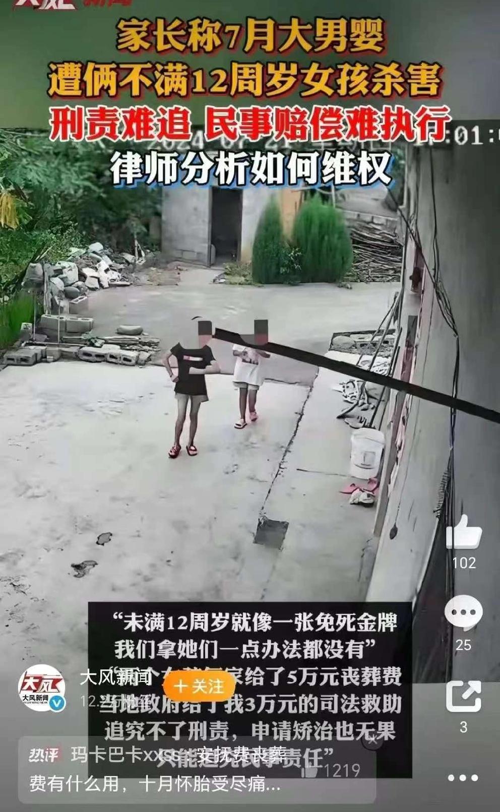 未成年有多可怕?害死人不用偿命也不坐牢。 广西的两个女孩,一个11岁,一个9岁,这两女孩把邻居家7个月大的男婴联手弄死了。 男婴的妈妈耳朵听不见,爸爸不在家。两个女孩在房间里把婴儿抱起来摔,然后又用脚踩。最终一个好好的婴儿被她们残忍地折磨死了。 事后男婴的爸爸去报案了,警方经过调查,两个孩子因未满12岁,不予立案。判了家长要赔90多万,对方只赔了10万元后说没钱赔。 这两个孩子还在正常上学,像什么都没发生一样生活。 按道理来说杀人就该偿命,未成年不能是坏孩子的免死金牌。
