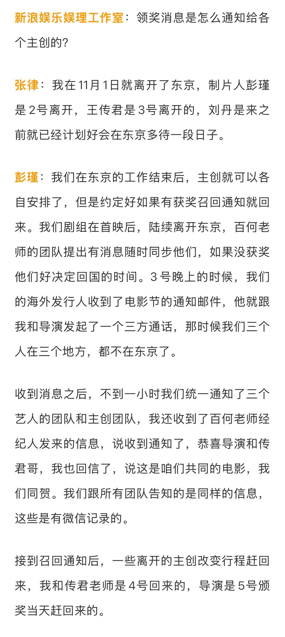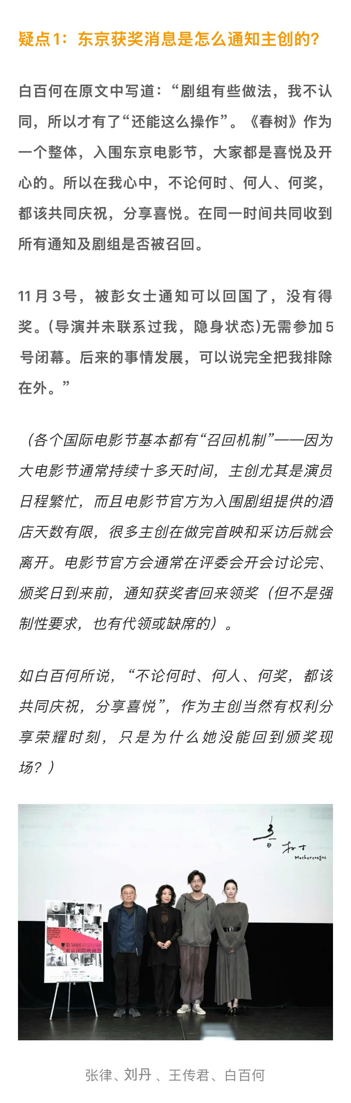 张律内心希望白百何得奖 谈及网友热议的“《春树》只有导演和男主获奖”一事,张律导演表示:东京电影节颁发的是最佳男演员奖,不是最佳男主角奖,如果分主角配角的话,王传君拿最佳男主角奖也是没问题的,他确实就是《春树》的男一号,表现有目共睹。我向我们团队包括传君都表达过,我内心希望白百何得奖,因为我实在喜欢她这次的表演。最终结果是这样的,应该说评委们的看法及决定也应该得到尊重,这是一种共识…娱理独家↓