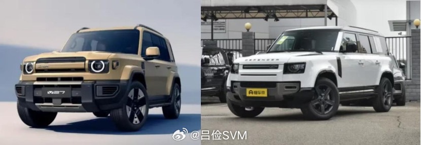 为何方盒子长得都像卫士?因为有些设计规则,是不可被打破的,比如近1:1宽高比,短前悬,垂直车头和粗壮C柱,都是经典方盒子的灵魂设计。另外,圆灯、外挂备胎,这些符号也太有记忆点了。(图四)