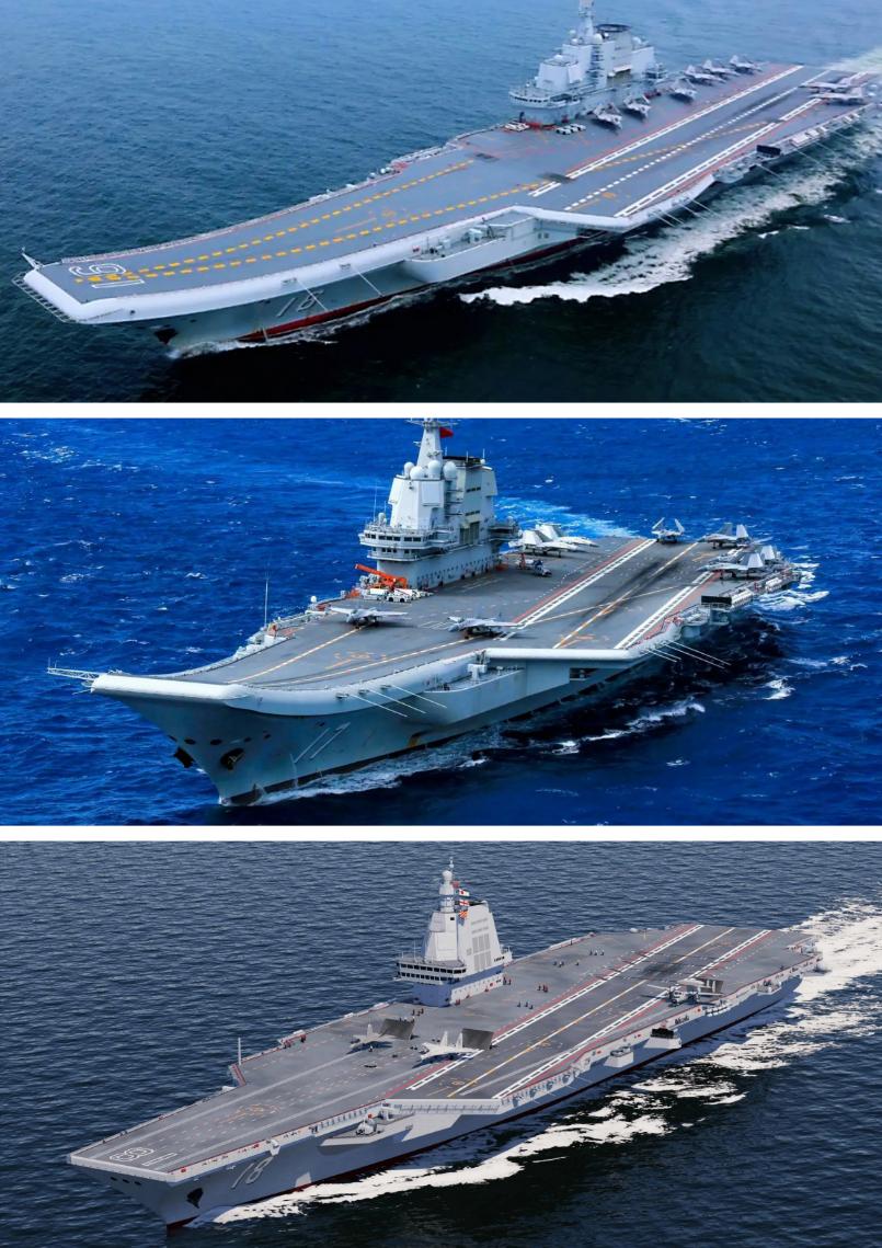 看看吧!这就是我们中国三大航母的区别,单就外形而言,真是不比较不知道,一比较吓一跳! 辽宁舰是2012年9月25日入列,山东舰是2019年12月17日入列,福建舰是2025年11月5日入列,时间间隔分别是7年和6年。在如此短的时间内,我们中国的航母制造真正是跨越式发展,全世界绝无仅有! 且不说技术原理,单就外形来看,感觉三大航母简直就不是一个时代的产物。首先我们看一下航母甲板,辽宁舰和山东舰的甲板前面都是翘起来的,呈现坡状,而福建舰的甲板完全是平坦的。再看舰岛,从辽宁舰到山东舰,再到福建舰,舰岛是变得越来越小,这就意味着航母甲板的可利用面积越来越大,能够搭载的飞机越来越多。 如此巨大的变化,简直就是老人机和智能手机的区别啊!不知道几年之后,第四艘航母又会是什么样子呢?