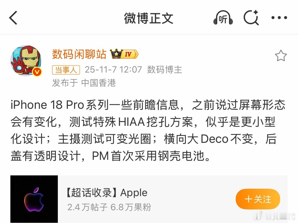 iPhone18Pro系列前瞻iPhone 18 Pro外观肯定是不变的,一样的大镜头设计,灵动岛也许会缩小一丢丢[无聊]