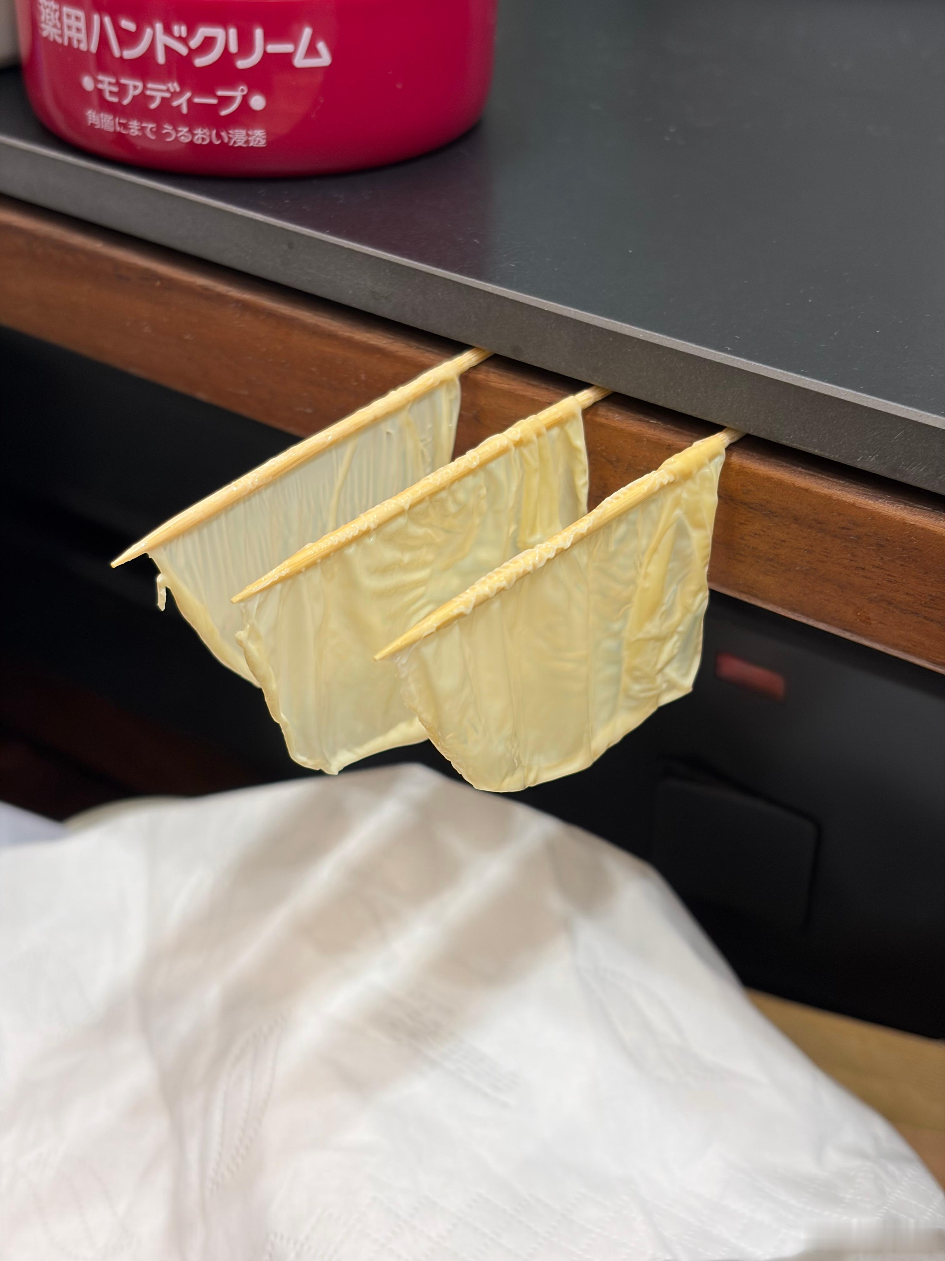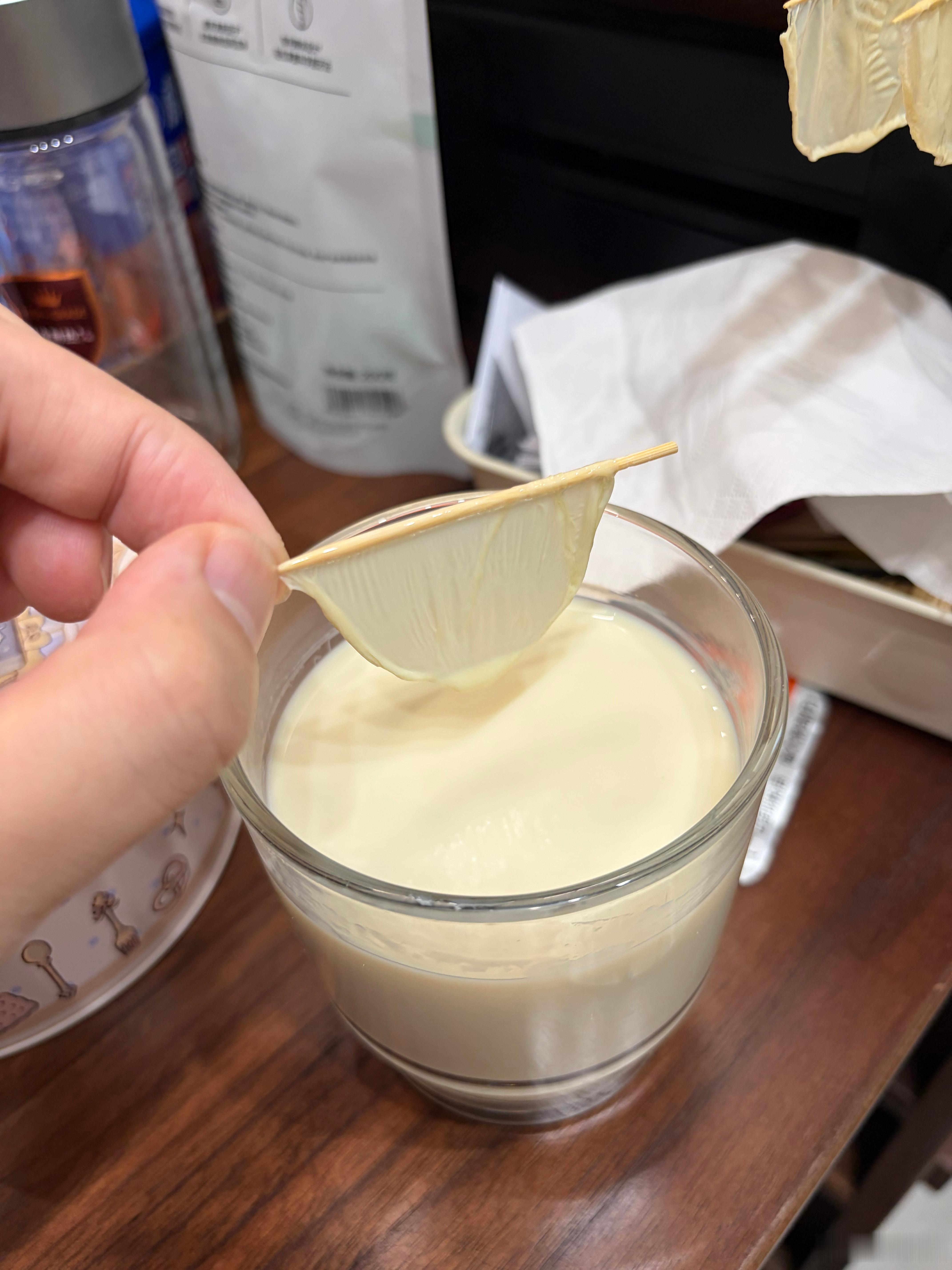 试了一下,一杯豆浆可以用牙签挑起三块豆皮[doge]