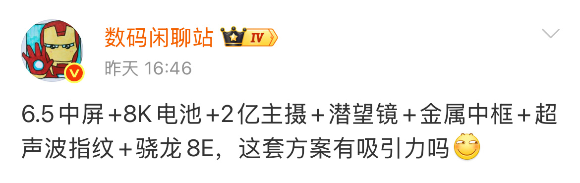 据爆料荣耀500系列配置很顶,荣耀500和荣耀500Pro两款机型,全系搭载高通骁龙8系芯片,6.5英寸,金属中框+玻璃后盖,2亿主摄,同款Magic8旗舰AIMAGE影像引擎,全系支持幻影引擎3.0,超声波指纹解,8K大电池,Pro版本影像有潜望长焦,性能对标旗舰机型,这样的越级配置,你们受得了吗?[doge][doge][doge]小明说科技[超话]
