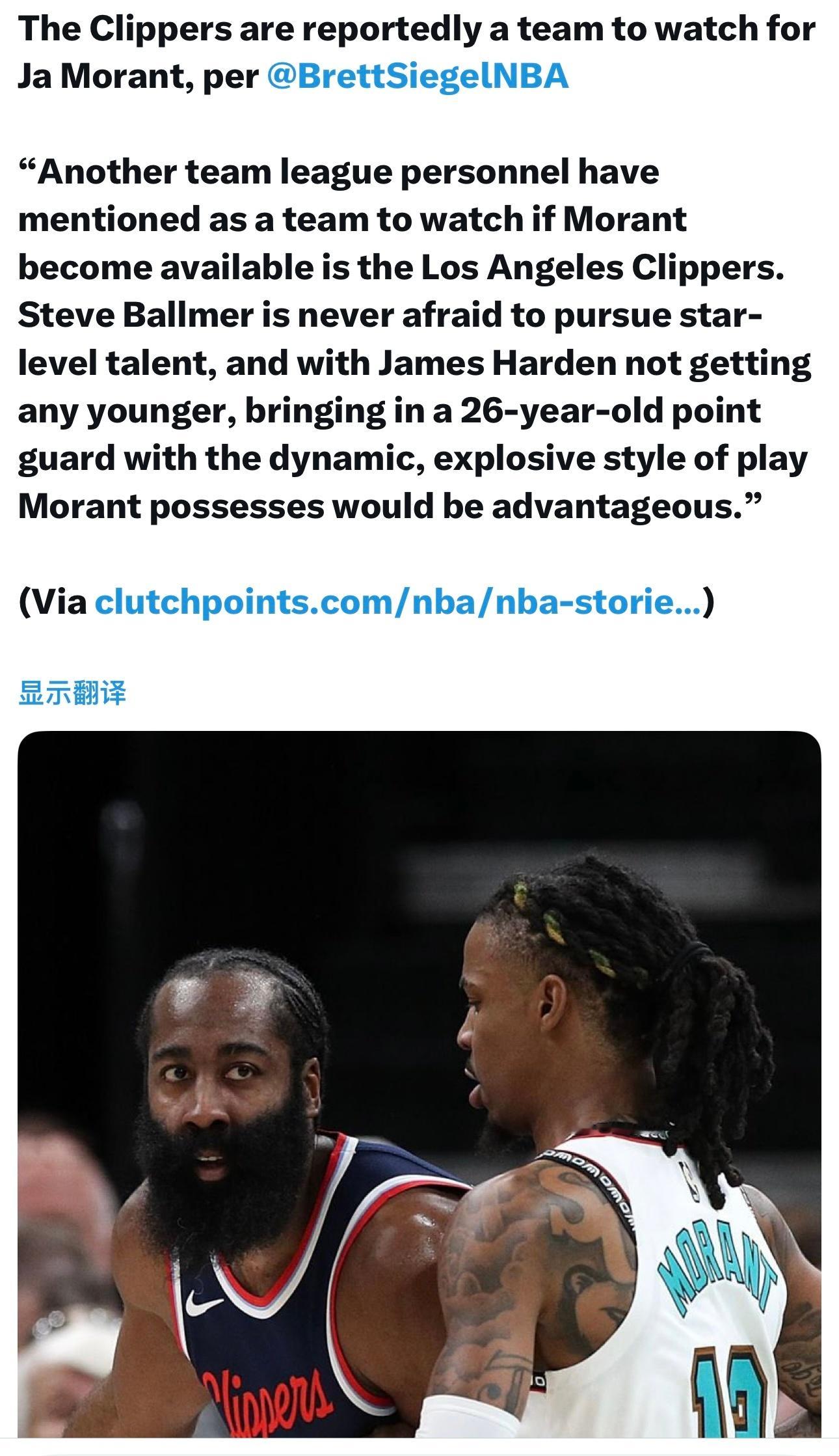 “联盟内部人士提到的另一支值得关注的球队是洛杉矶快船。鲍尔默从不畏惧追逐球星级别的球员,而且随着哈登年龄的增长,引进一位26岁、拥有莫兰特那般充满活力和爆发力球风的控卫将是有必要的。”