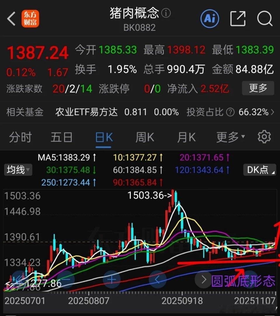 自2024年9月启动一波趋势性上涨后,猪肉概念于2025年9月15日触及1503点阶段高点,随后开启回调,一个多月内累计跌幅达10%。当前板块已完成止跌企稳,底部区域构筑成型,技术面释放积极信号:MACD指标低位金叉后持续上行,指数成功站上60日线与60月线双重关键均线,正式开启向上运行态势。