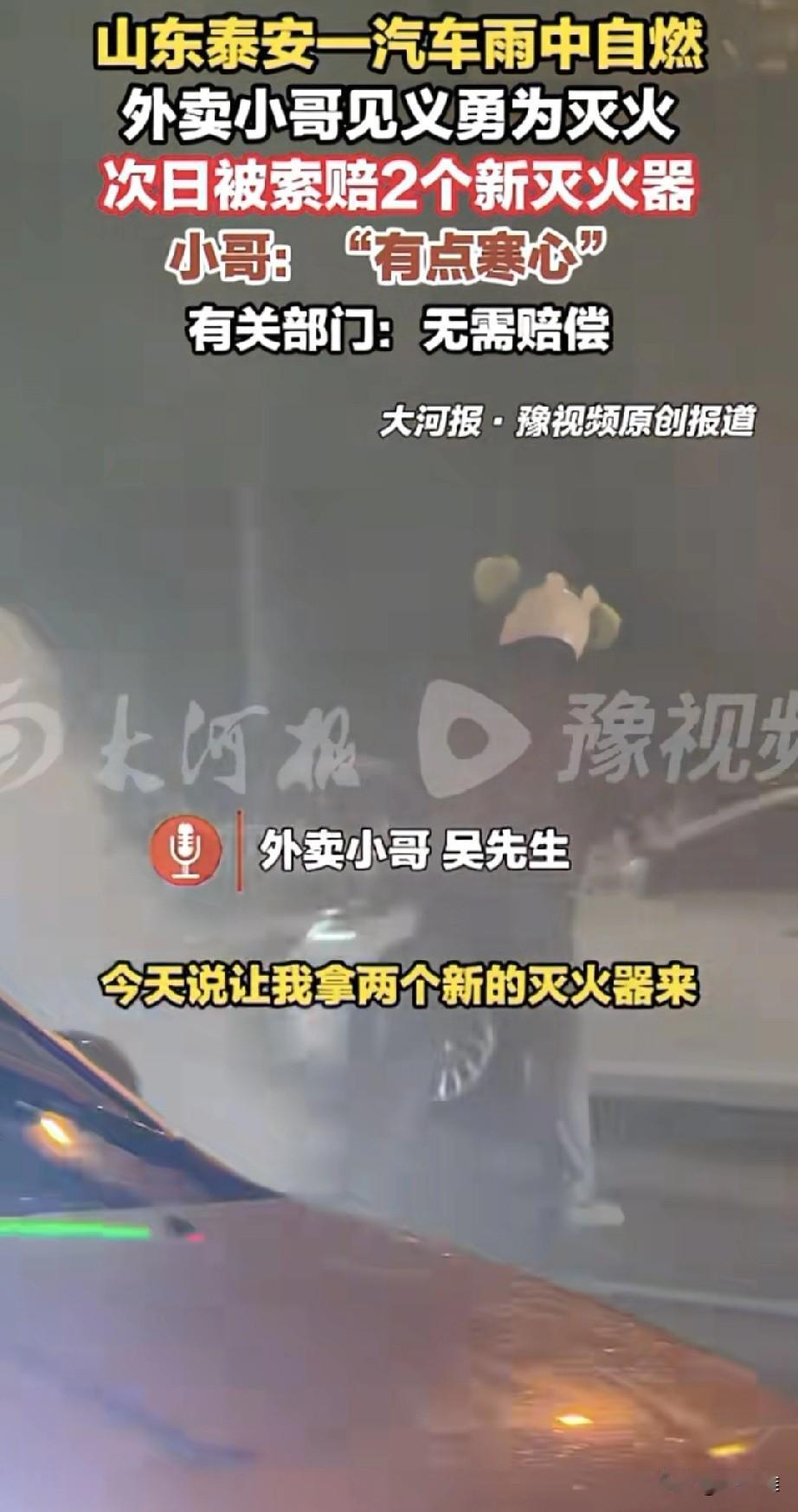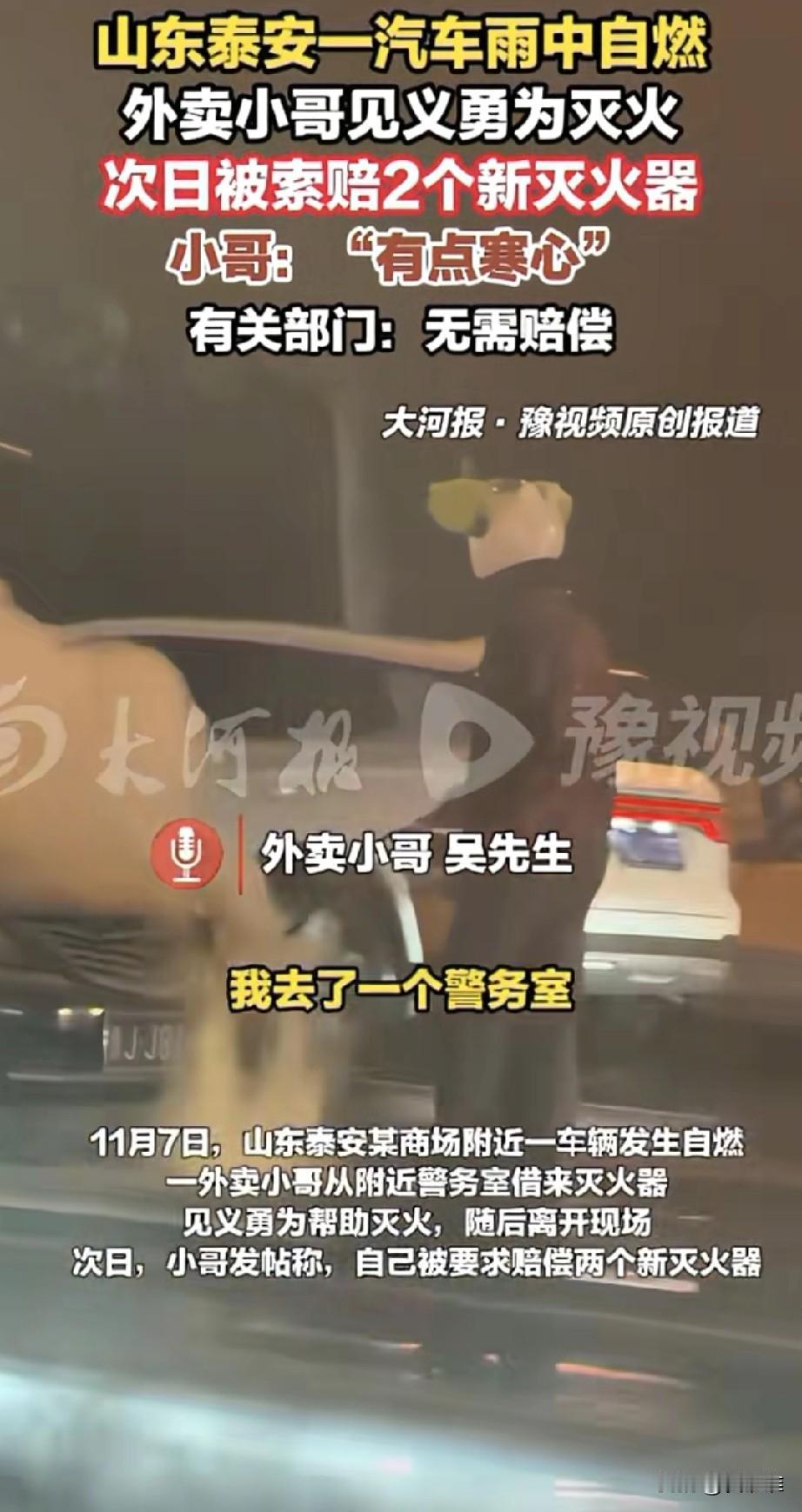 好人心寒,外卖小哥送餐途中遇到汽车自燃上前救火,第二天却被要求赔偿灭火器。山东泰安一家商场门前,一辆汽车突然自燃,路过的行人纷纷避让,而一位送餐小哥却反应迅速,跑到附近的一个警务工作室,提起两个灭火器就冲到了起火的汽车前,对准火苗按下了灭火器的开关,等到消防员来了之后他才默默的离开。本以为会受到表扬的他第二天却发文称:“警务室要求他赔偿两个新灭火器。”就在网友纷纷指责的时候,当地有关方面回应:事情已经妥善解决,不需要小哥赔偿! 我想说:这些外卖快递小哥是无数平凡英雄的缩影,他们用自己的行动告诉我们,英雄不必身披金甲,也可以是风雨中那个为你递上餐食快递的普通身影。我们不能让英雄流血又流泪,职业无高低,善良与责任,才是最珍贵的。