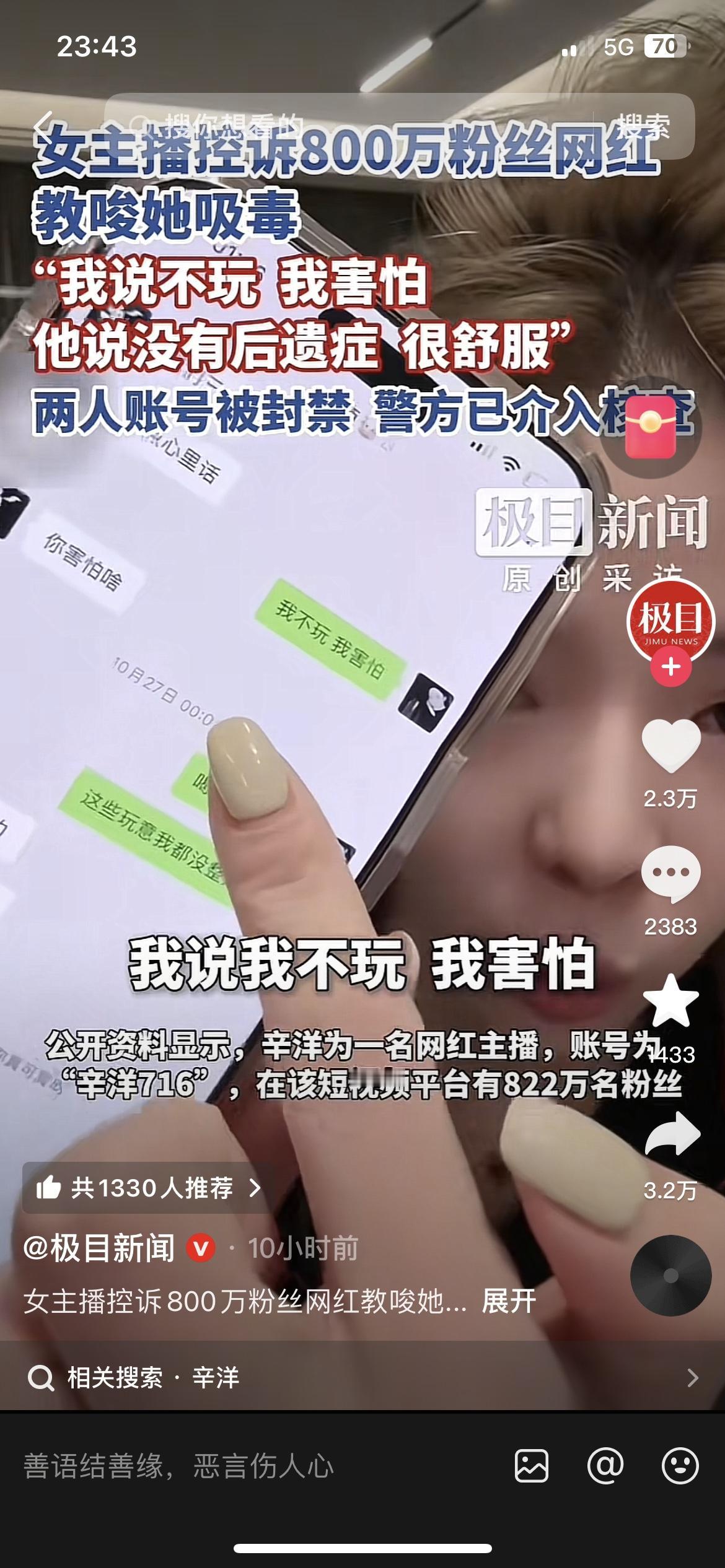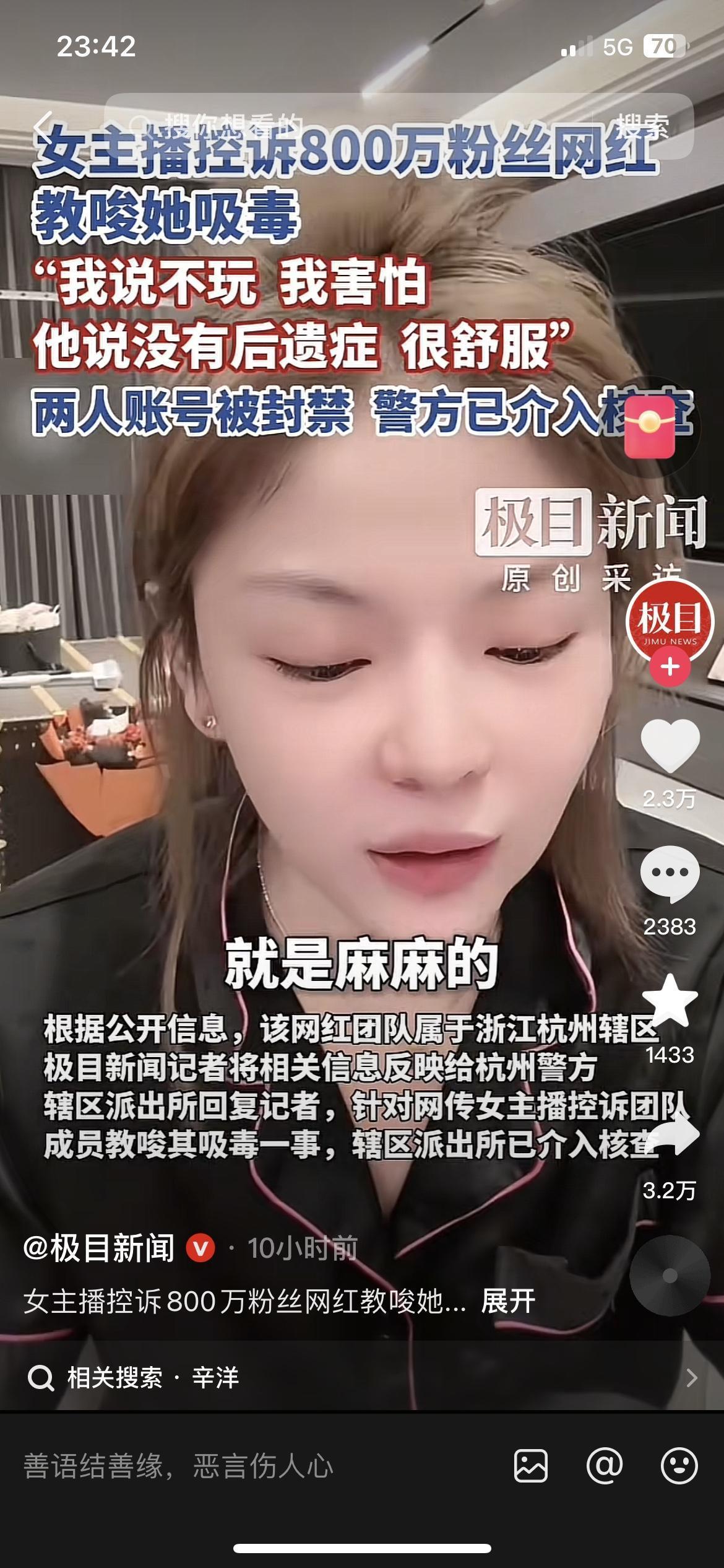 800万粉网红教女主播吸毒,还说“没后遗症”?这是要把人害死啊! 刚刷到炸锅的事儿(信息来源:看度新闻/极目新闻):女主播“可意妹妹”直播爆锤——822万粉的“辛洋716”拉她碰毒,她一开始吓得说“我怕”,对方直接拍板:“害啥怕,没后遗症”,现在她居然说“那东西麻麻的,挺舒服”… “没后遗症”?这是人能说出来的话?毒品是啥?是沾了就毁一辈子的鬼东西!这800万粉的网红,是真没脑子,还是坏到骨子里了? 现在俩人账号全封了,杭州警方已经介入核查(信息来源:看度新闻/极目新闻),但我就想问:大网红的“嘴”,凭啥能这么害人?平台对这些百万粉博主,就没点底线约束吗? 你们要是碰到有人跟你说“毒品没危害”,会直接怼回去吗?评论区说说你们的反应! 女主播称被教唆吸毒